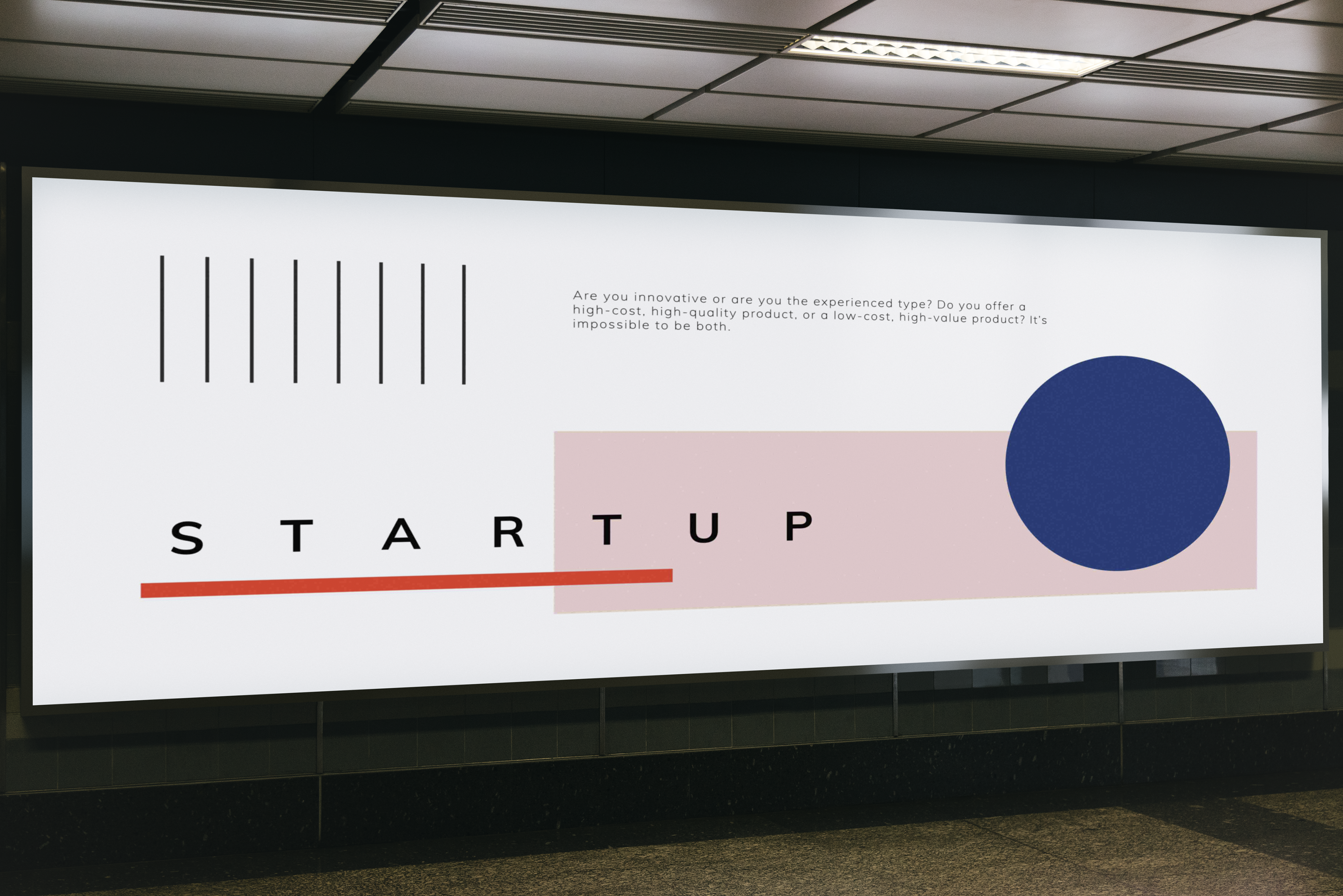The mockup image depicts a sleek, illuminated advertising billboard placed in a modern subway station. The main object features minimalist design elements, including geometric shapes such as thin vertical lines, a large blue circle, and a red horizontal stripe. This is an ideal backdrop for promoting a startup or any contemporary brand, leveraging its bold and clean aesthetics. Utilize this mockup generator to craft your unique advertisement and share your innovative designs on social media today!