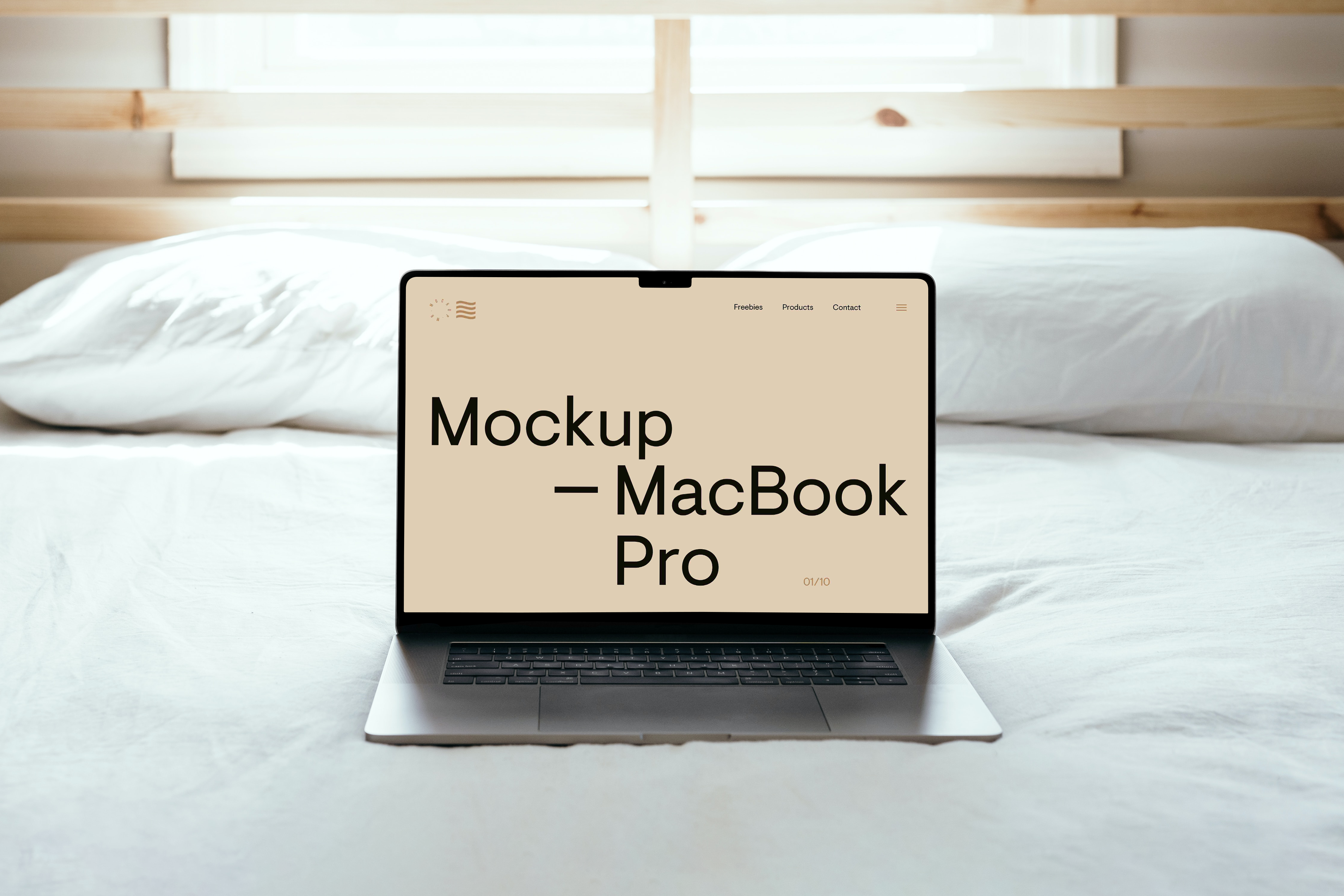 A MacBook Pro displaying a beige screen with the text "Mockup - MacBook Pro" as a template is placed on a neatly made bed with white linens.