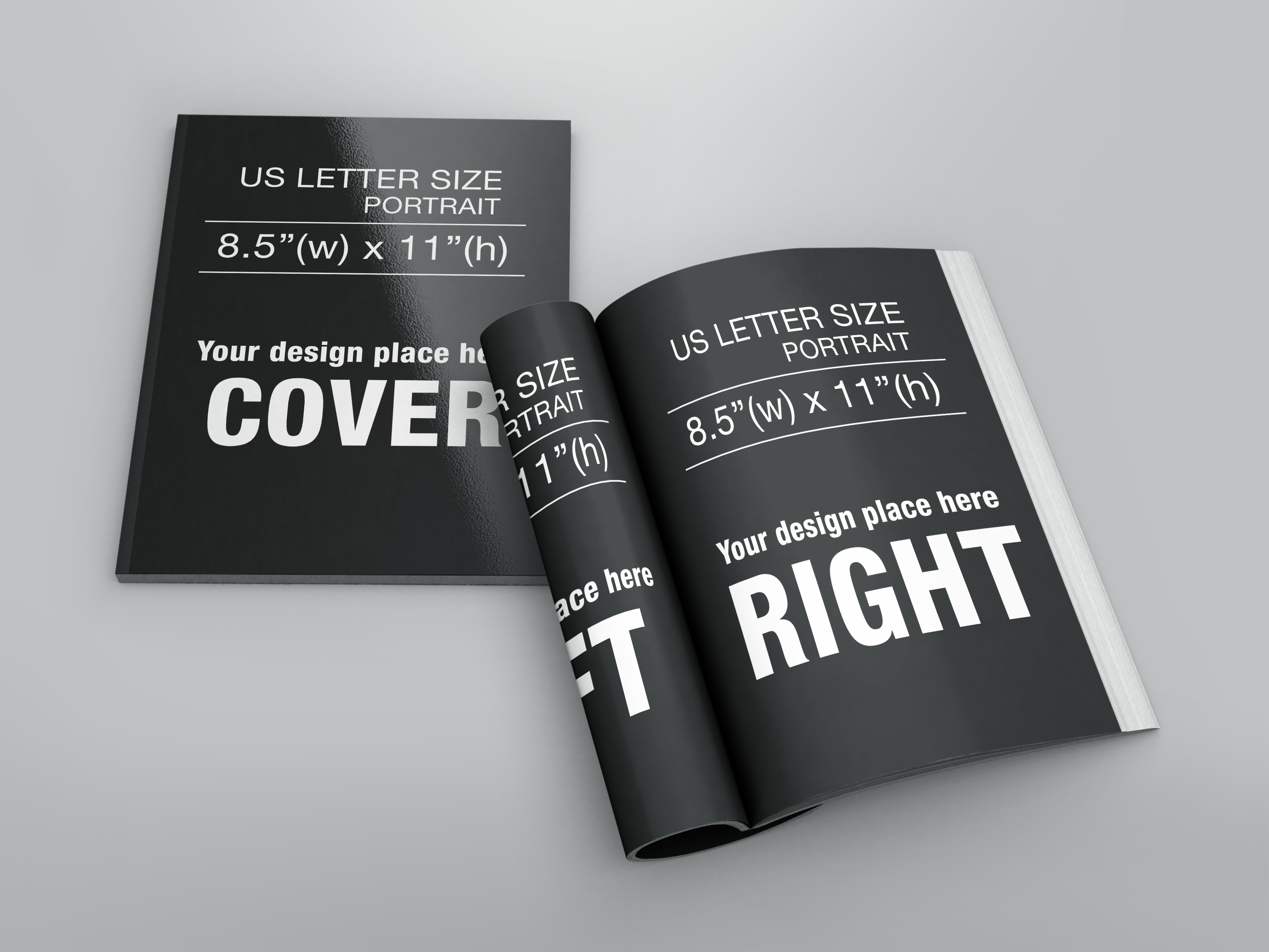 The mockup image showcases a magazine in a minimalist, light gray setting. The main object is a US letter-sized magazine in portrait orientation, featuring both the cover and an open page. The cover and pages are blank, providing ample space to insert your designs. Use this mockup to advertise your magazine layouts, cover designs, or content. Generate stunning mockups easily and share them on social media to captivate your audience. Utilize our mockup generator today and showcase your creativity!