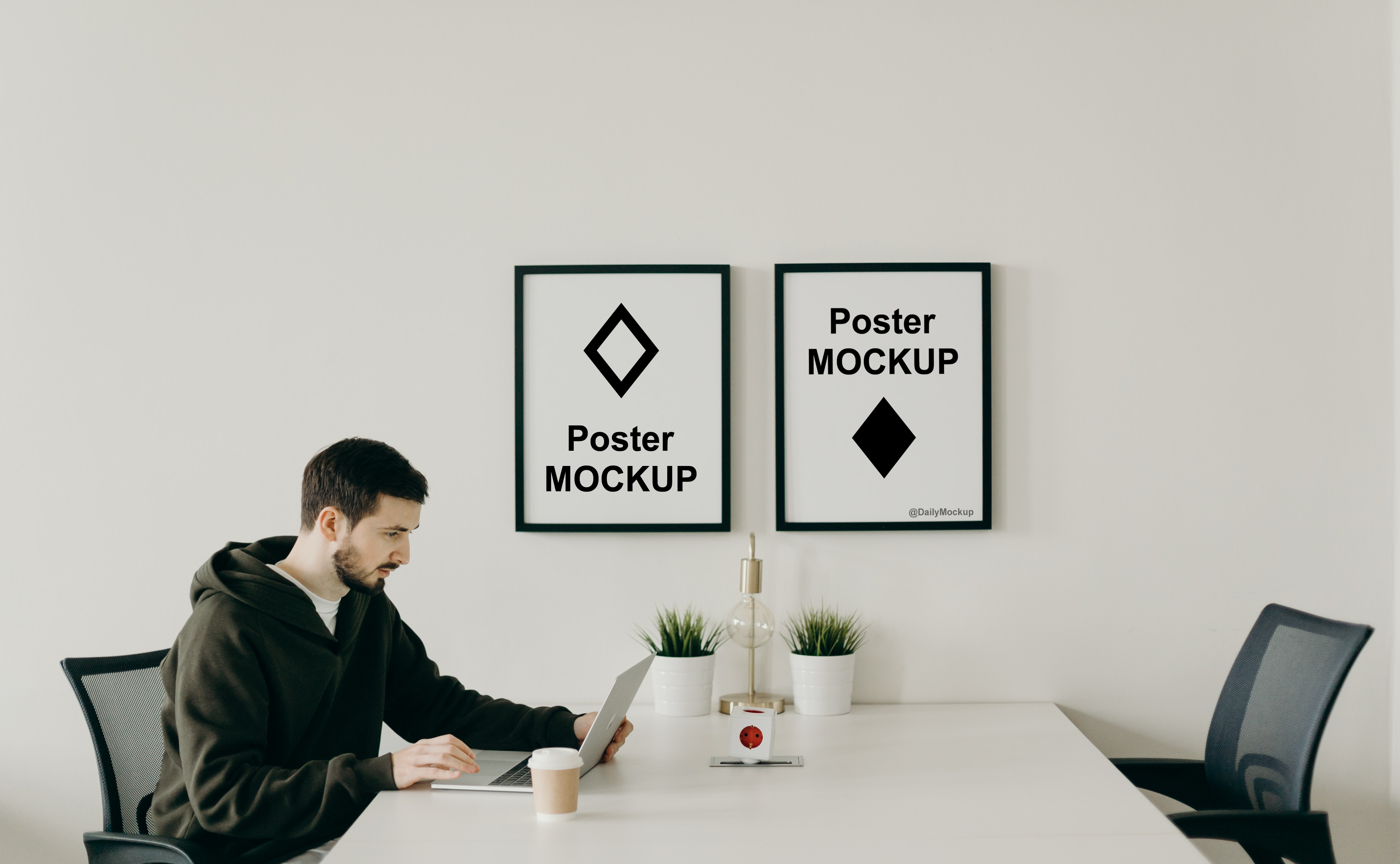The mockup image showcases a modern office setting with a white wall and minimalistic decor. It features two framed posters with basic geometric designs hanging side by side. Below the posters is a desk with potted plants, a small decor item, and a man working on a laptop. This mockup is perfect for advertising artwork or motivational quotes in a professional environment. Use the mockup generator to create your design and share it on social media for maximum impact!