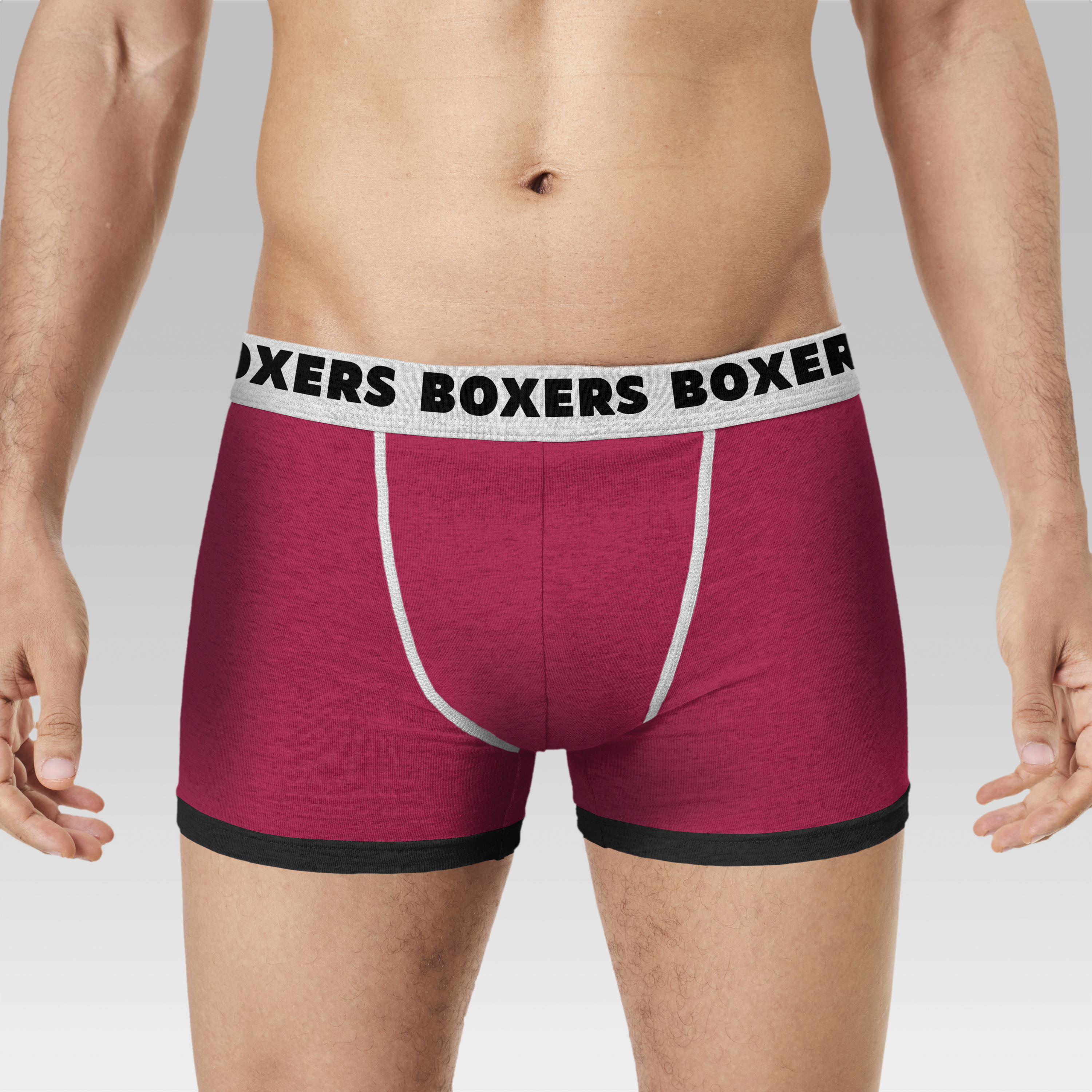 The mockup image showcases a pair of men's boxers in a simple indoor setting with a gray gradient background. The dominant color of the boxers is maroon, with black trimming on the leg openings and a white waistband that has repetitive black text. Use this mockup to personalize designs, perfect for advertising new product lines or brand campaigns. Use the mockup generator now and share your unique designs on social media!
