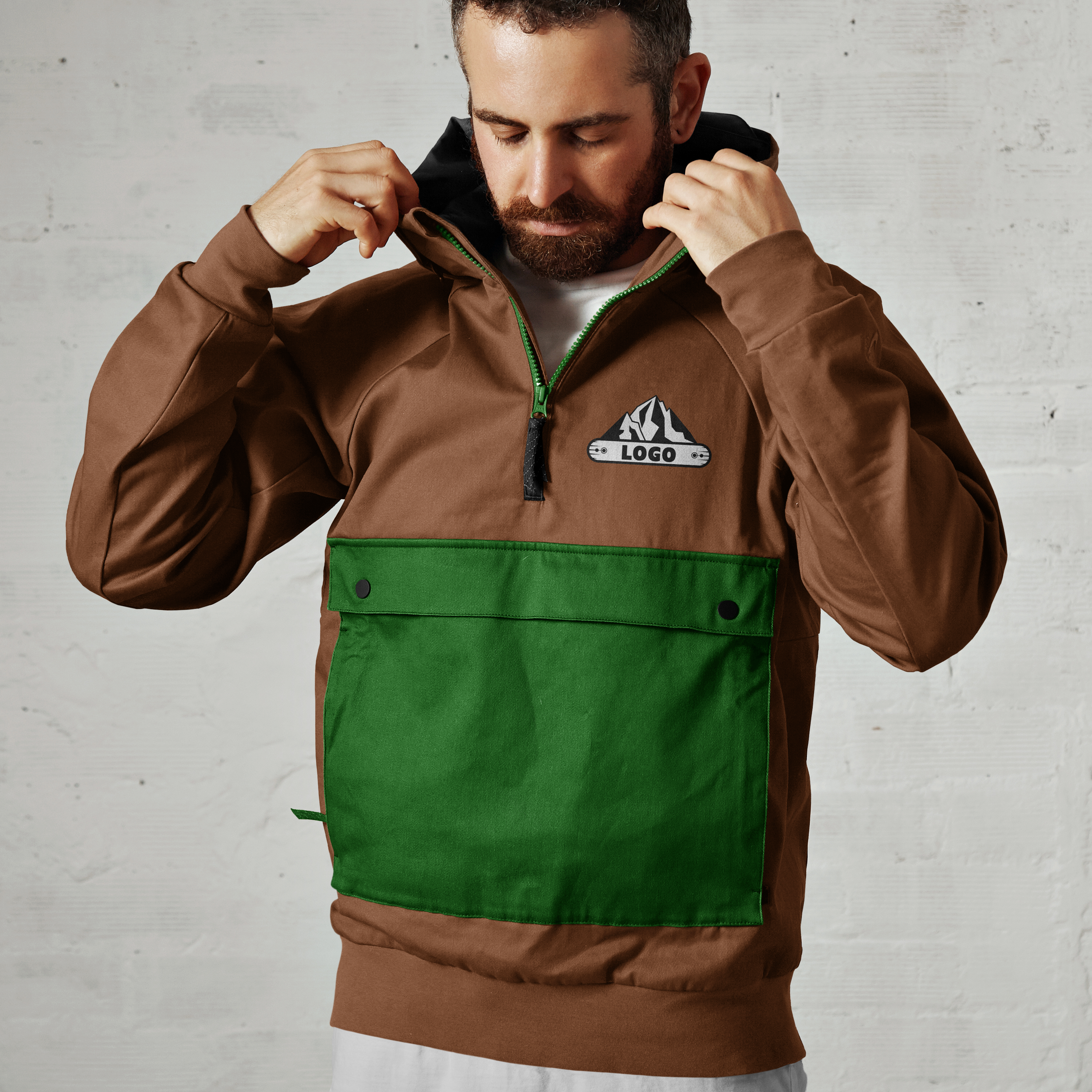 The image features a man adjusting the hood of a brown and green jacket against a light-colored, textured wall. The jacket displays a zipper and a pocket with buttoned flaps, with a prominent logo on the chest area. This mockup is perfect for showcasing your apparel designs, creating appealing visuals for advertising campaigns. Use the mockup generator to customize the design and share your unique creations on social media for maximum exposure and engagement.