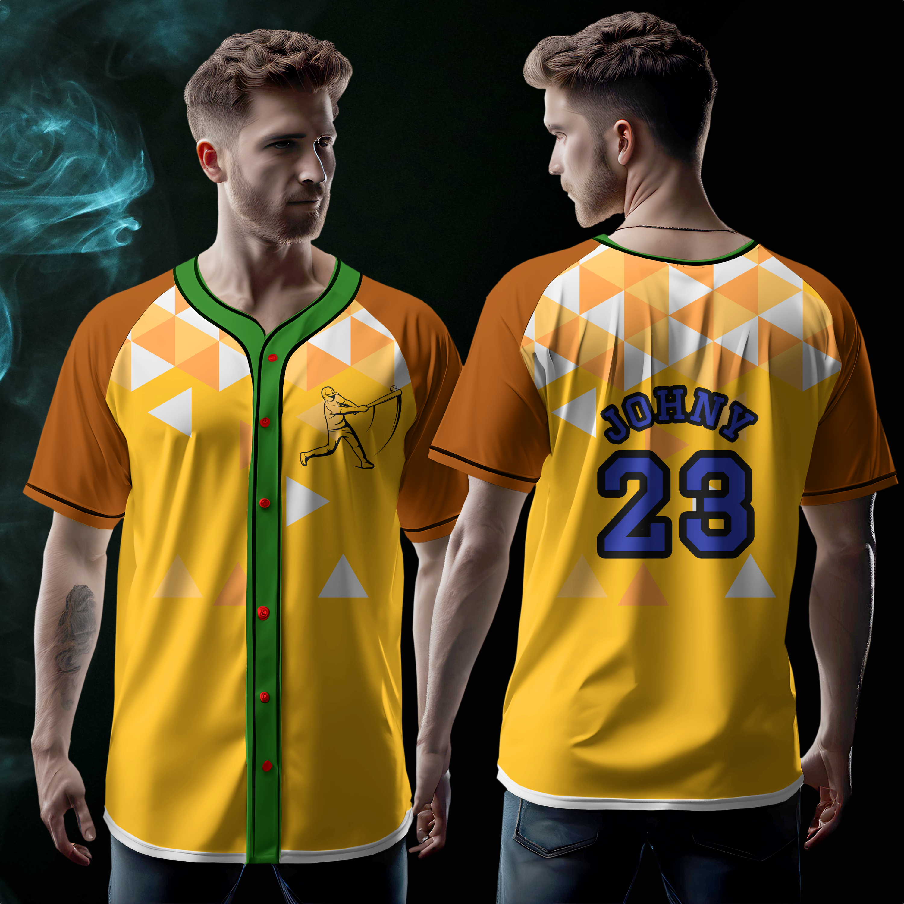 The mockup image showcases a vibrant, custom-designed sports jersey being worn by a model in front of a smoky black background. The main object features a yellow base with orange and white triangular patterns, green trim, red buttons, and an illustrated sports figure. The back highlights a personalized name "Johny" and the number "23." Use this mockup generator to create eye-catching designs for sports team uniforms or promotional wearables. Share your unique design on social media now!