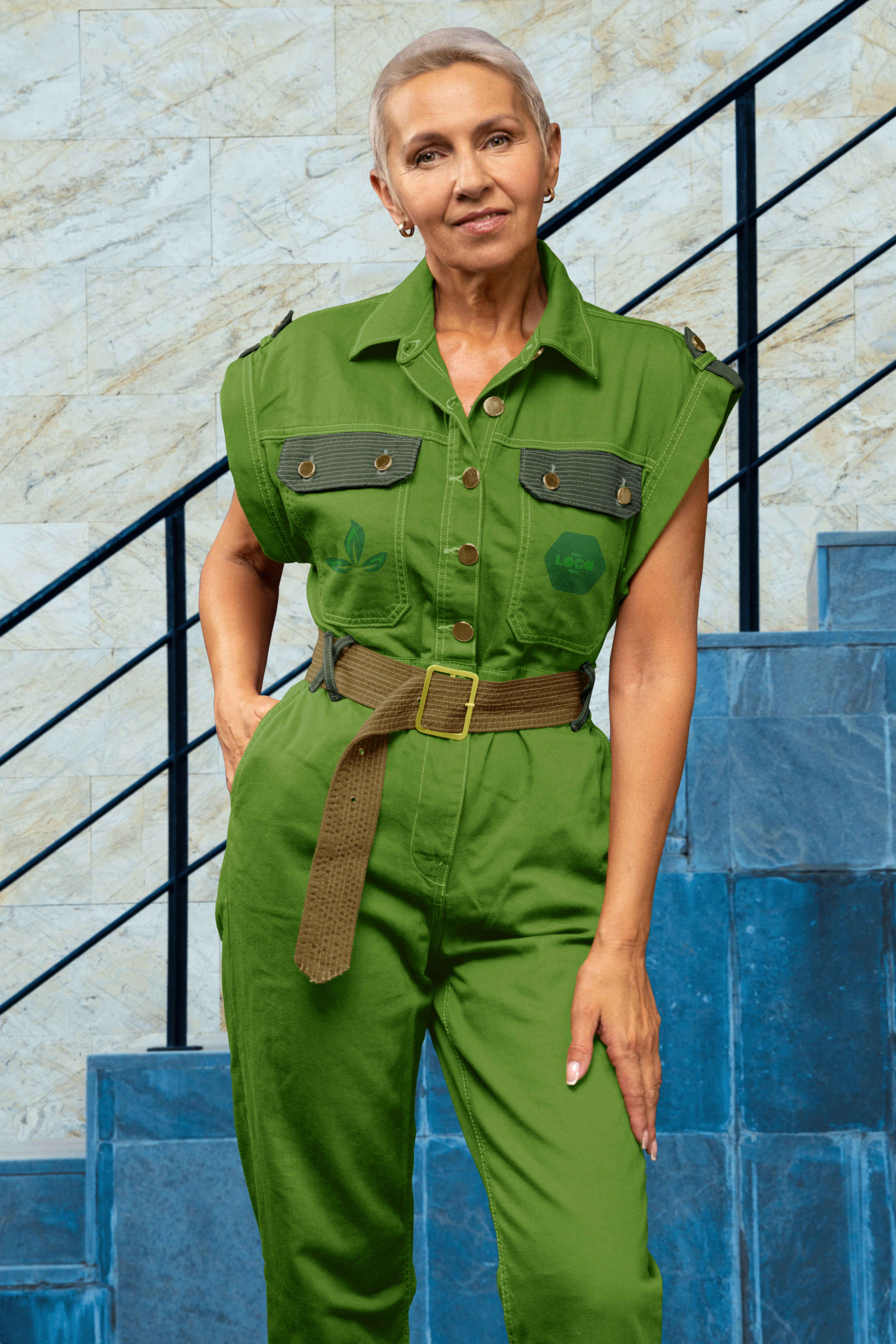 The image depicts a mature woman in a bright green jumpsuit, accented with two chest pockets and adorned with subtle leaf and logo designs. The background features a marbled wall and ascending blue stairs, suggesting an urban, stylish setting. This mockup is perfect for advertising eco-friendly or sustainable fashion lines. Use the mockup generator to customize your designs and share your unique creations on social media to attract and engage your audience effortlessly.