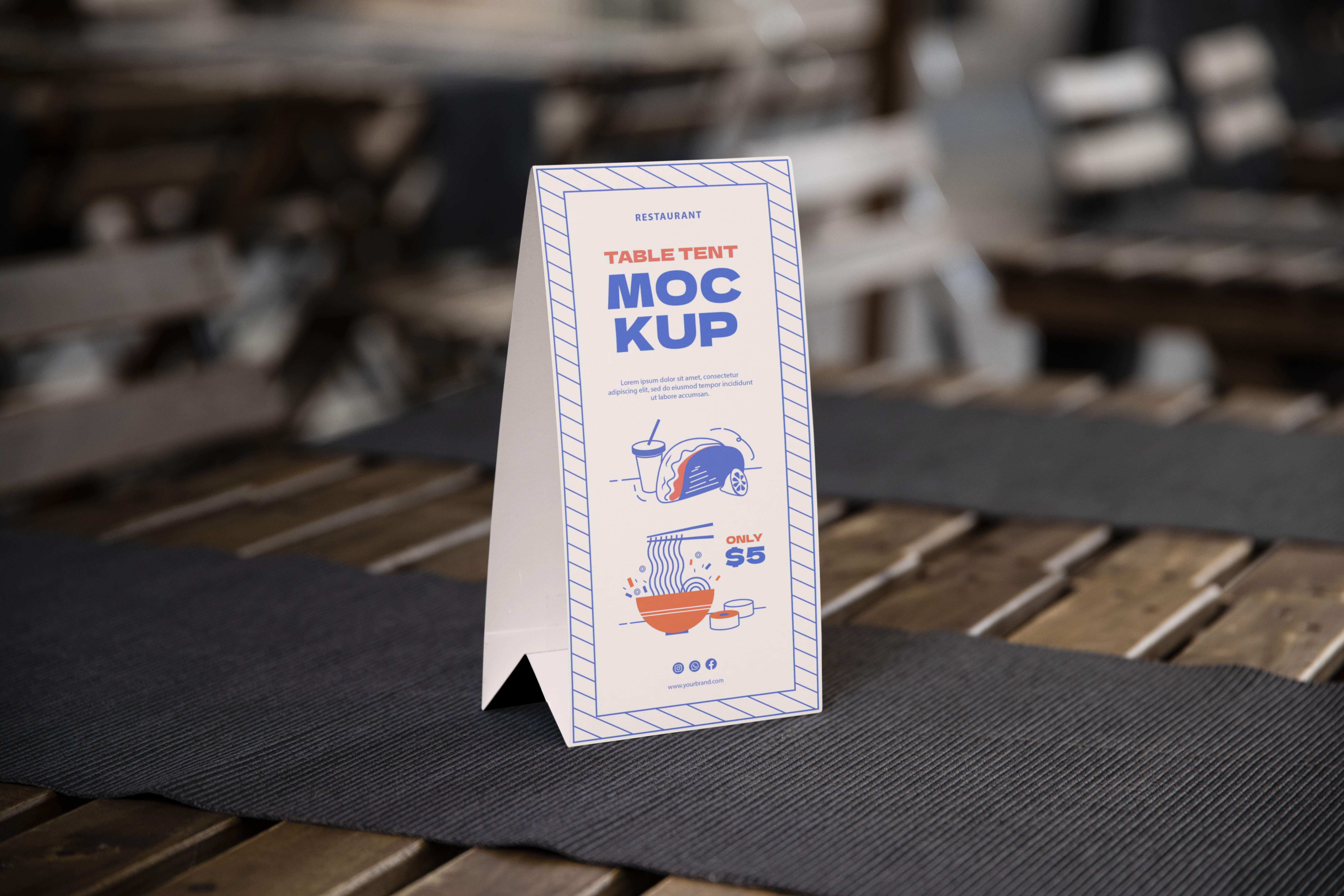This mockup features a table tent placed on a wooden table in an outdoor café setting. The background shows blurred wooden benches and tables, conveying a relaxed dining environment. The table tent itself has a clean, modern design with a blue and orange color scheme, highlighting a promotional offer with minimalistic illustrations. Use this mockup to advertise your restaurant’s deals by customizing the table tent. Create your design with our mockup generator, and share your creation on social media to attract more customers!