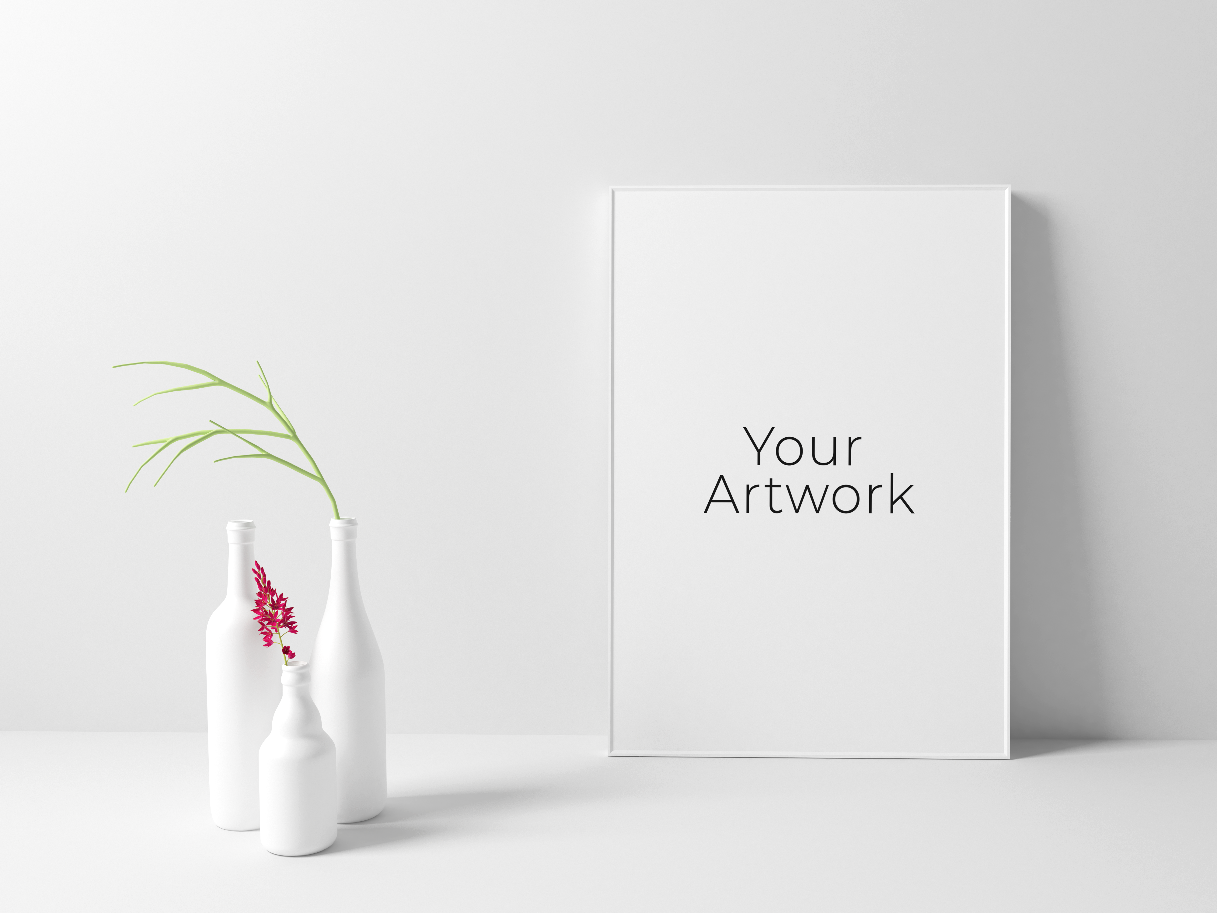 This mockup features a minimalist setting with a white background. The main object is a vertical poster frame positioned on a white surface. Beside it, three white vases differ in height, with simple green and red plant sprigs adding a touch of color. Use this mockup for advertising by showcasing your artwork or branding designs in a clean, stylish environment. Try the mockup generator now and share your fantastic designs on social media!