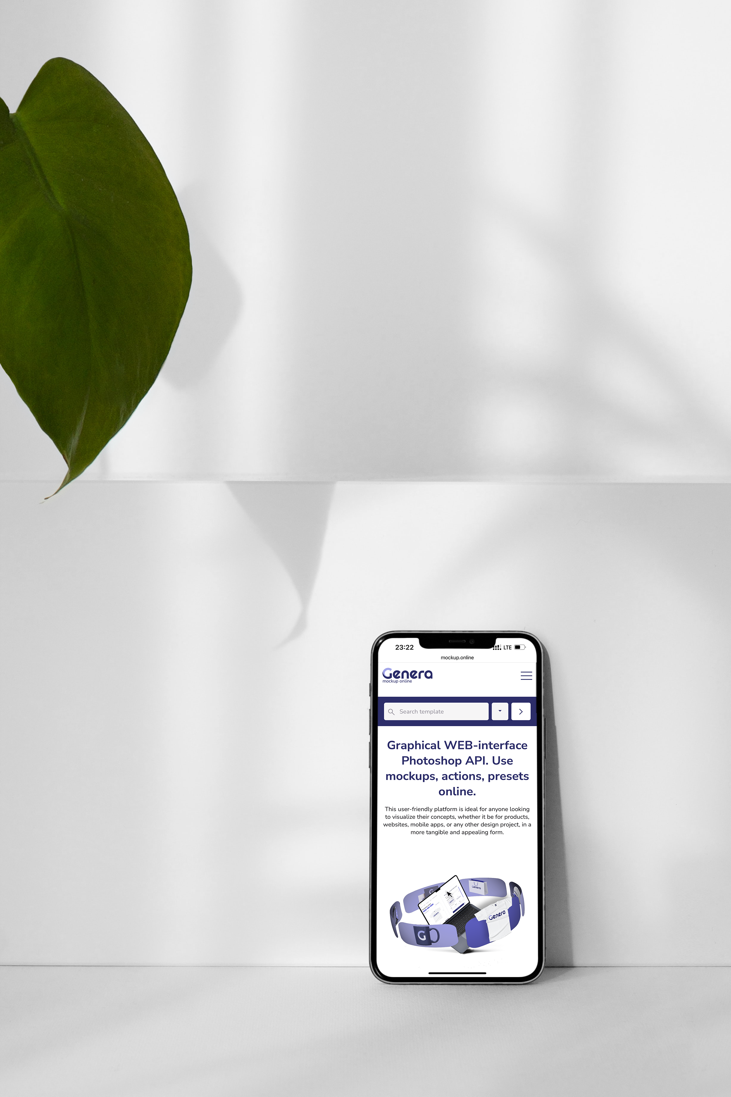 A mobile phone with a plant on it next to a white wall, serving as a template for mockup purposes.