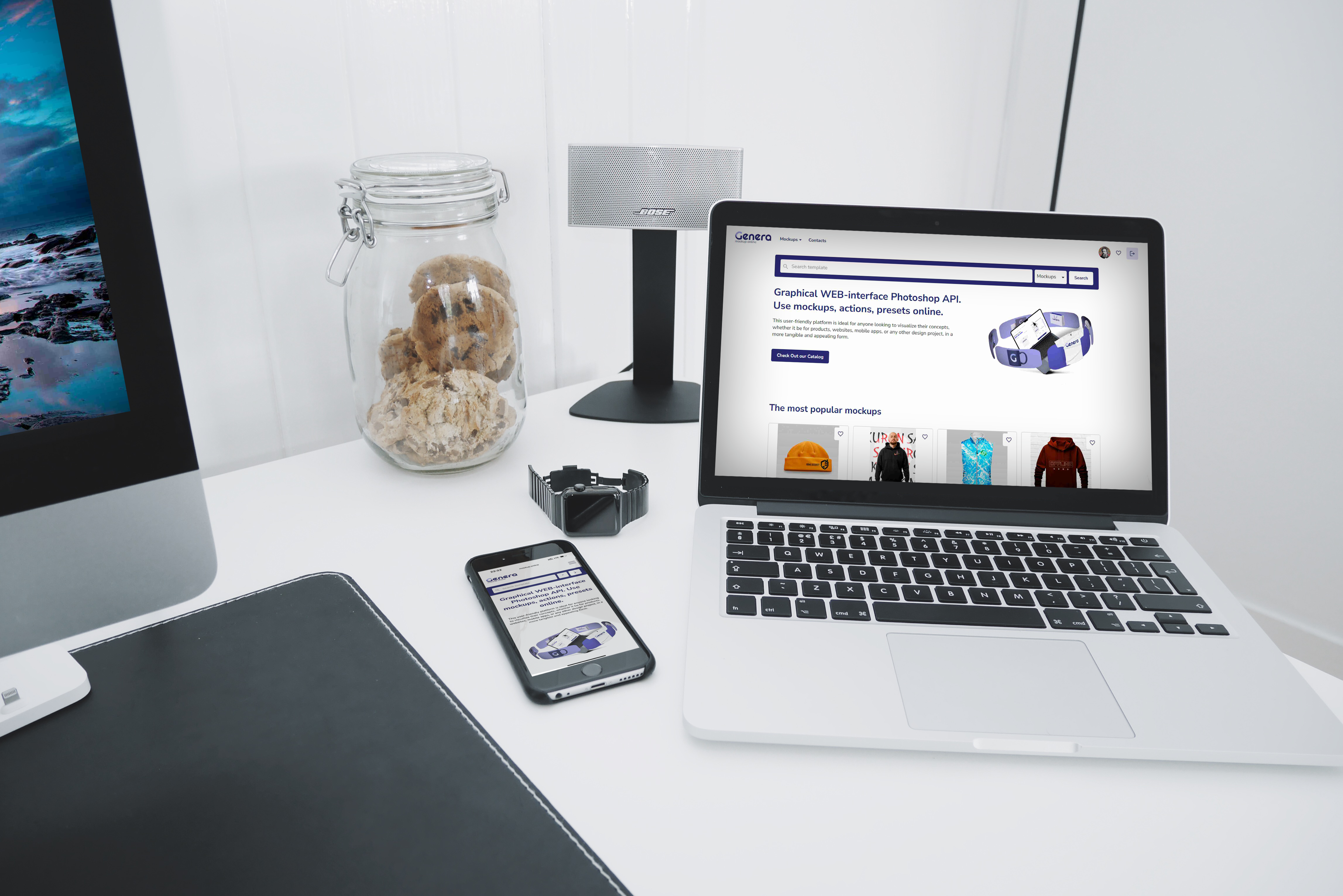 The mockup image showcases a bright, modern office setting with a white desk and a clear background. Central to the scene is a sleek laptop displaying a mockup generator website, accompanied by a smartphone showing the same website. Design elements include minimalist, professional icons and a clean layout. Use this mockup for advertising your digital products or services. Try out our mockup generator and share your custom design on social media to captivate your audience.