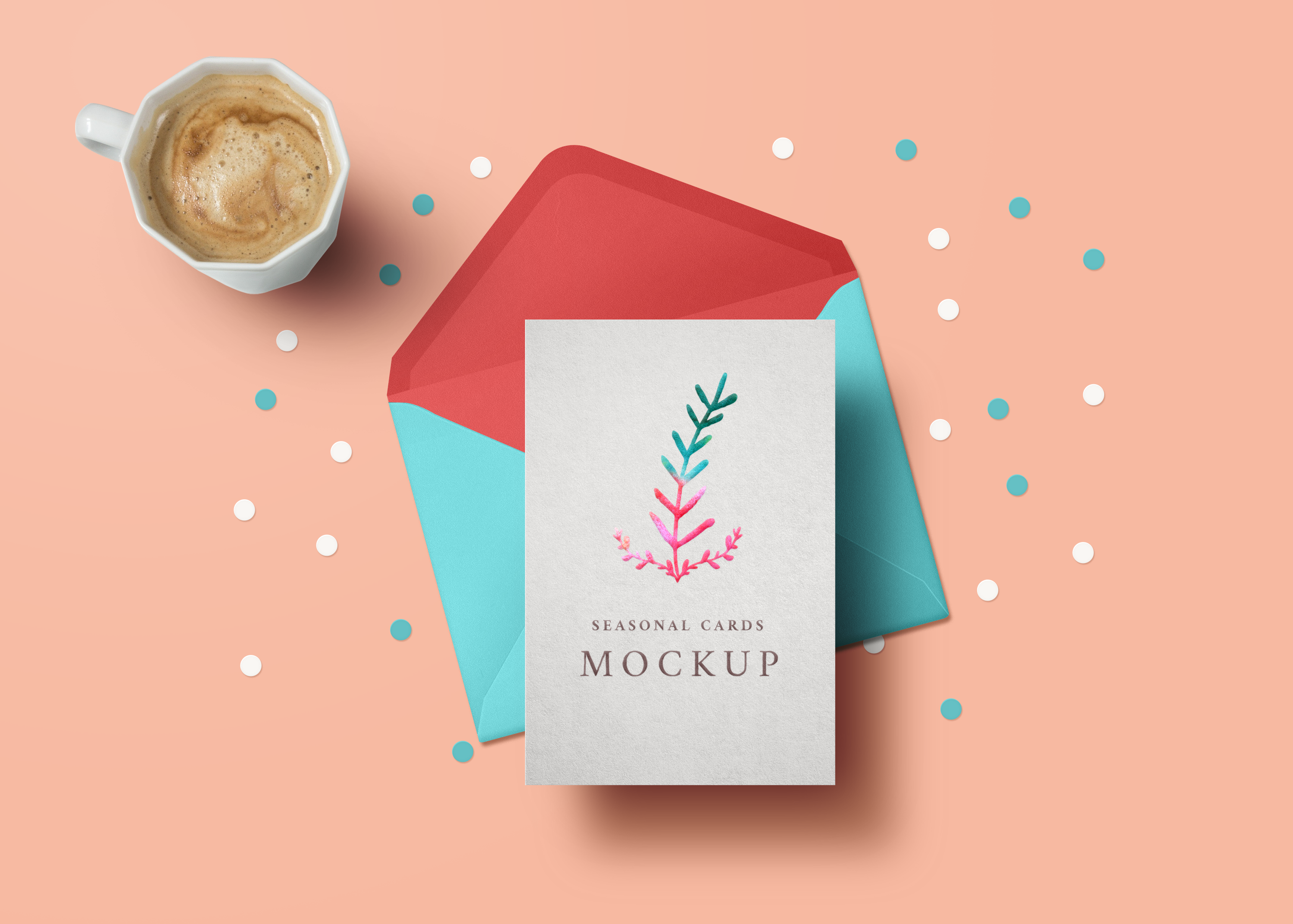 The mockup presents a minimalistic card on a peach background, set atop a colorfully contrasting envelope of red and turquoise. A cup of frothy coffee sits to the side. The card features a simple, elegant floral illustration with branches in pink and green hues. Blue and white dots add a playful touch. Use this mockup for seasonal card advertising, showcasing custom designs. Try our mockup generator and share your creations on social media to spread cheer!