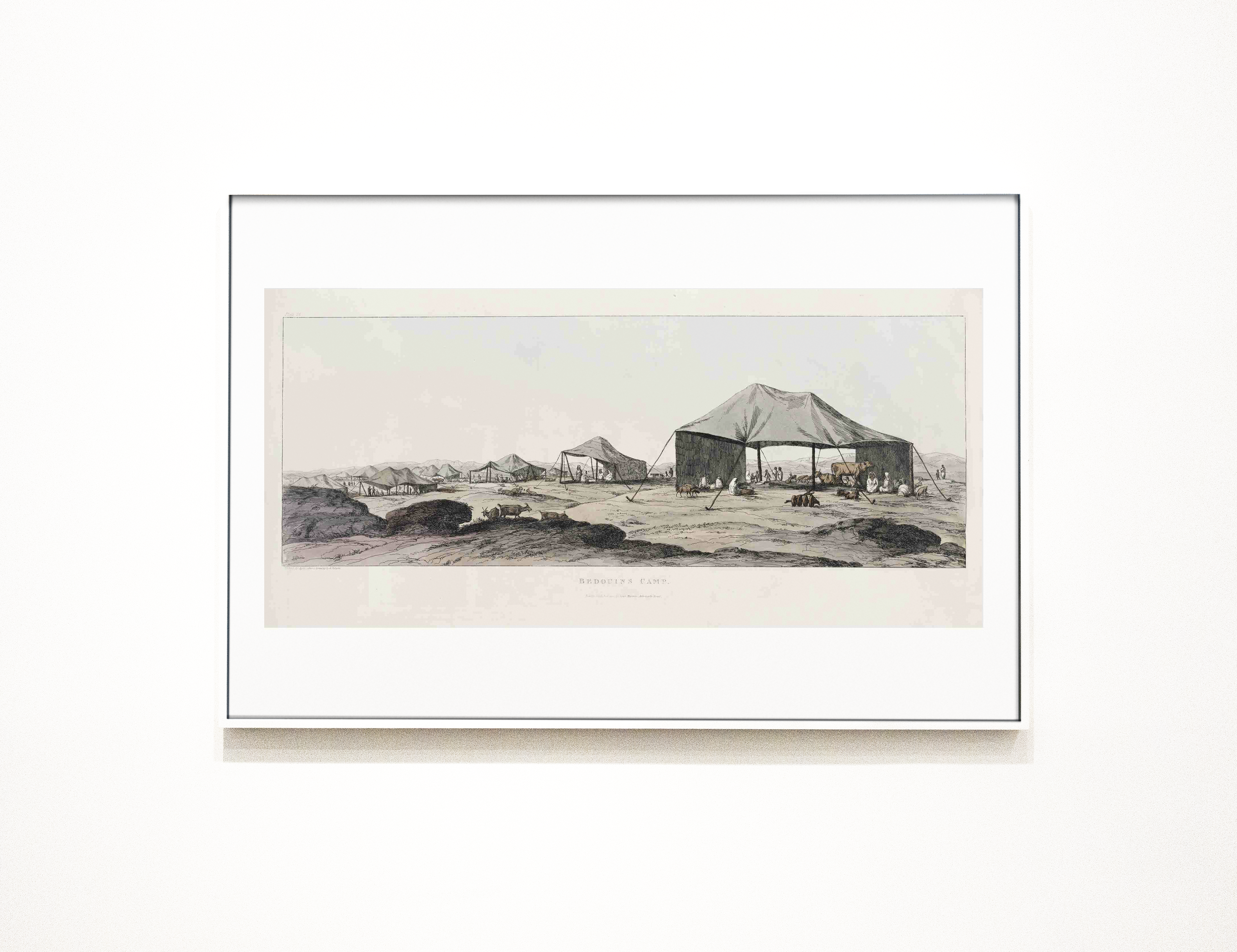 The mockup image showcases a framed piece of art depicting a serene desert camp scene with large tents and scattered vegetation. The frame is placed against a stark white wall, emphasizing the artwork. This minimalist setting makes it ideal for advertising home decor or art prints. Use this mockup generator to visualize your custom designs and share your unique creations on social media to attract attention and engagement. Try it now and showcase your creativity!