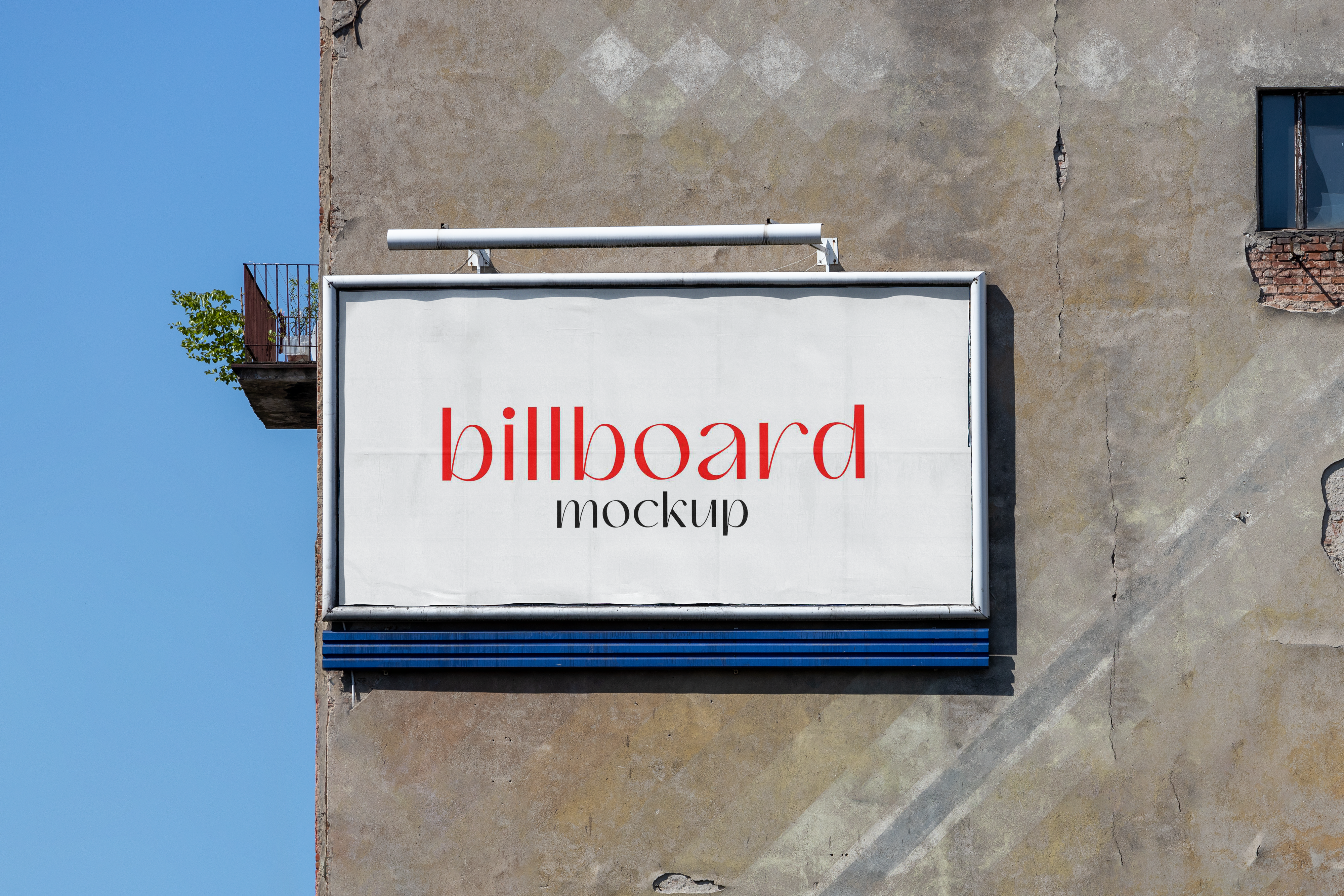 A mockup of a billboard mounted on a building wall with the word "billboard" in lowercase letters on a white background.