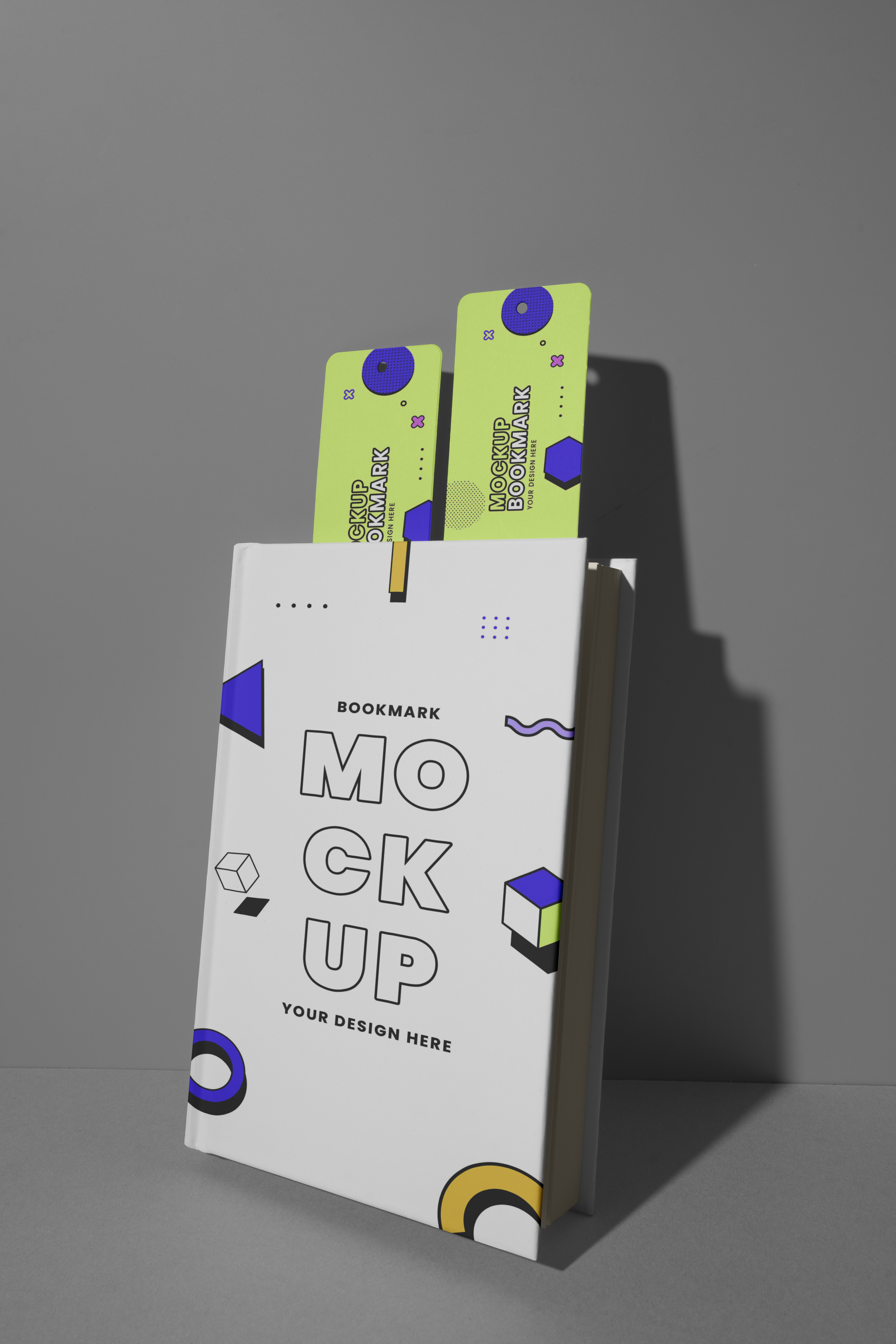 The mockup image features a simplistic, modern setting with a solid grey background. The main object is a book with a sleek cover adorned with geometric shapes in blue, yellow, and black. Two vibrant green bookmarks with similar geometric designs poke out from the top of the book. This mockup is perfect for advertising custom book cover and bookmark designs. Use this mockup generator to showcase your creative talents and share your unique designs on social media!