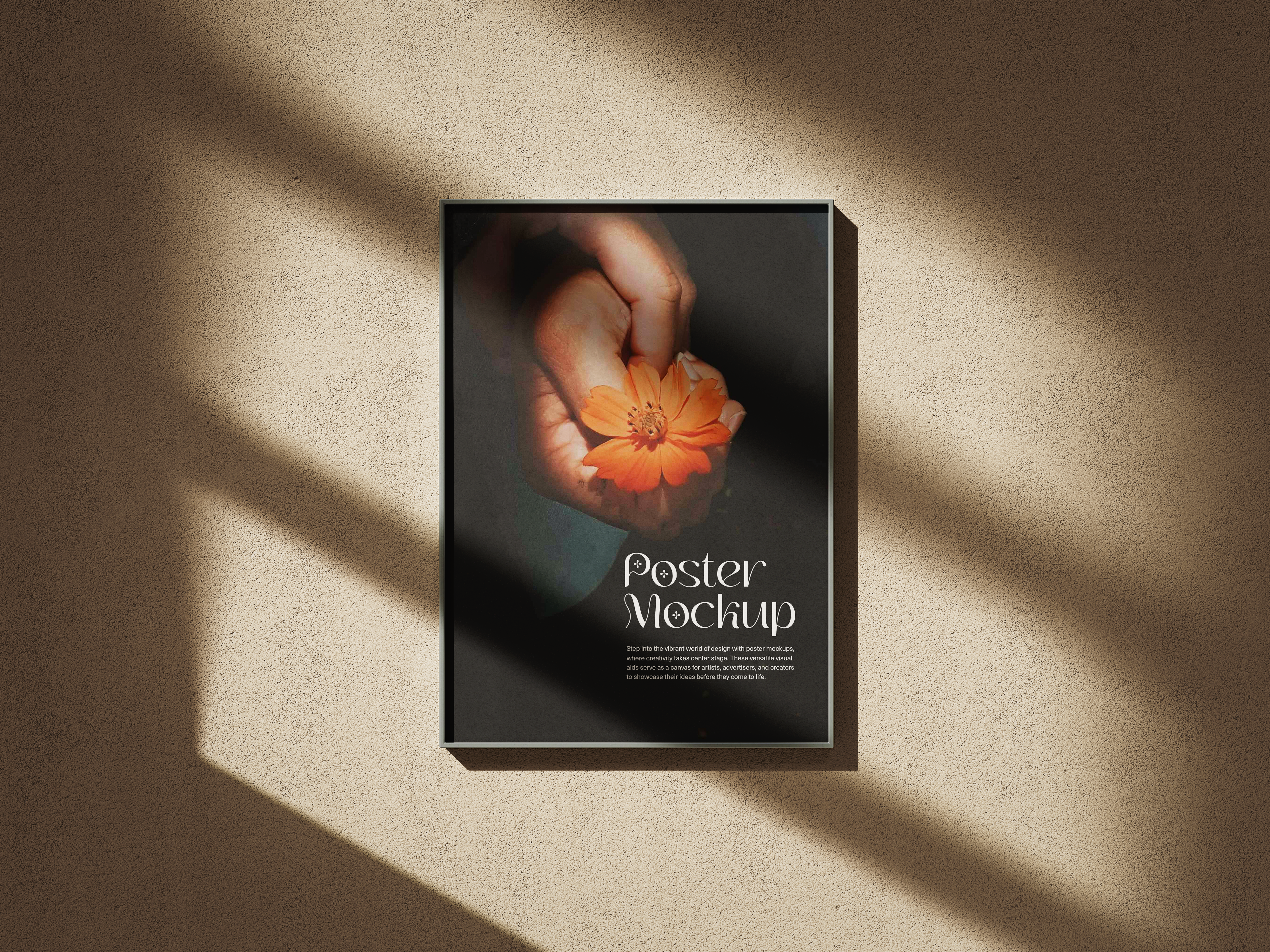 This clean and elegant mockup image showcases a framed poster hanging on a beige textured wall, illuminated by natural diagonal light shadows. The poster features a close-up design of a hand holding a vibrant orange flower against a dark background, emphasizing its striking visual appeal. Perfect for advertising artistic prints, event promotions, or brand messages. Use this mockup generator to bring your design ideas to life and share your creations on social media for maximum impact!