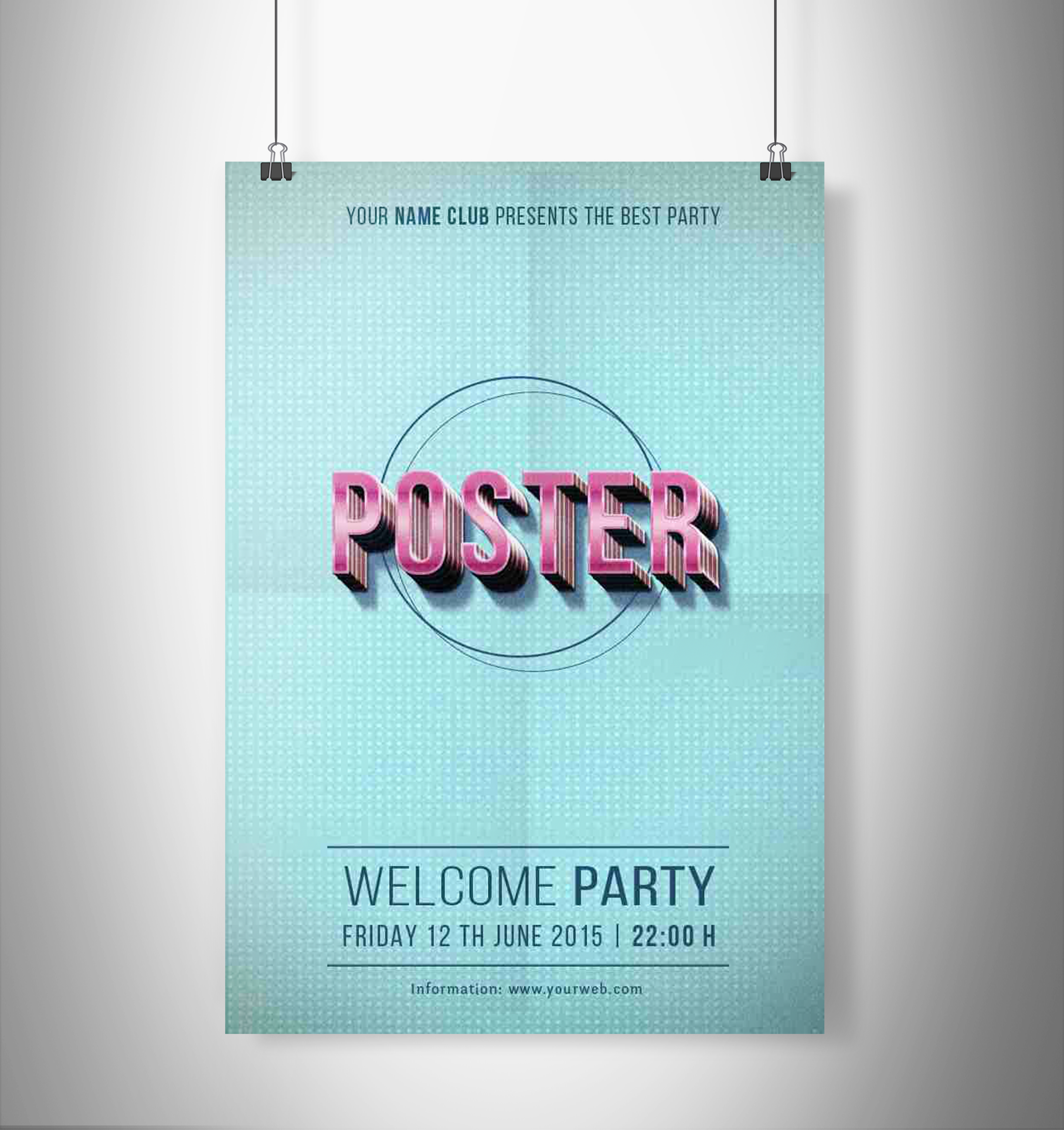 The mockup image shows a vibrant poster displayed against a clean, well-lit wall, hanging by clips. The poster features a light blue background with a subtle dot pattern and a bold, 3D "POSTER" text in pink and purple hues, accented by a circular outline. The setting is minimalistic and modern. You can use this mockup to advertise events, parties, or promotions with eye-catching designs. Utilize the mockup generator to create your own unique poster and share your creation on social media!