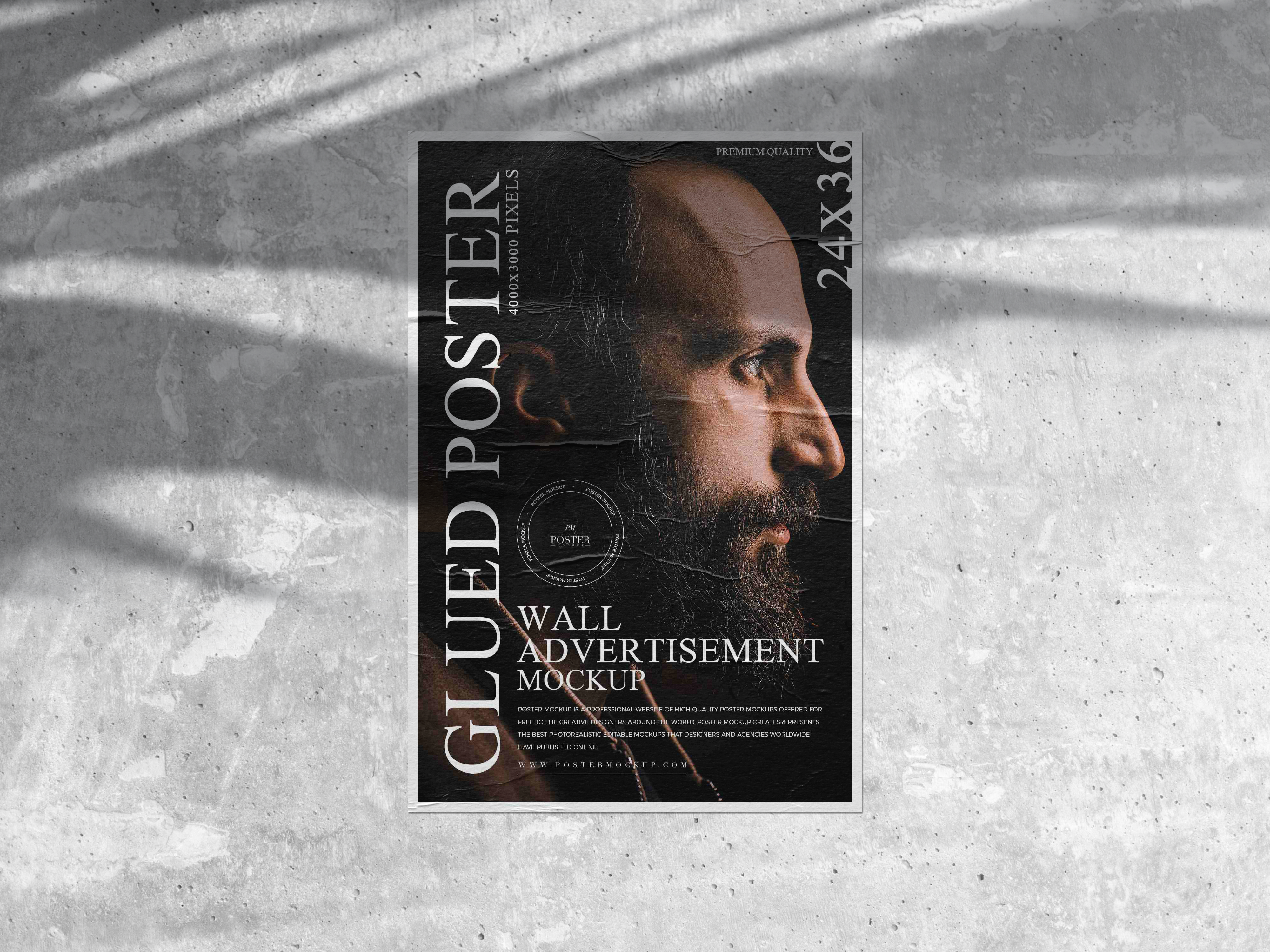 This mockup features a poster adhered to a concrete wall with dappled shadows. The main object is a well-composed poster displaying a man's profile with a crumpled texture and a sleek, dark theme. The design elements include a bold header, a centered seal graphic, and professional typography. It's ideal for promoting artistic events or products with a modern flair. Use this mockup generator to visualize your brand and share your unique design on social media for maximum impact!