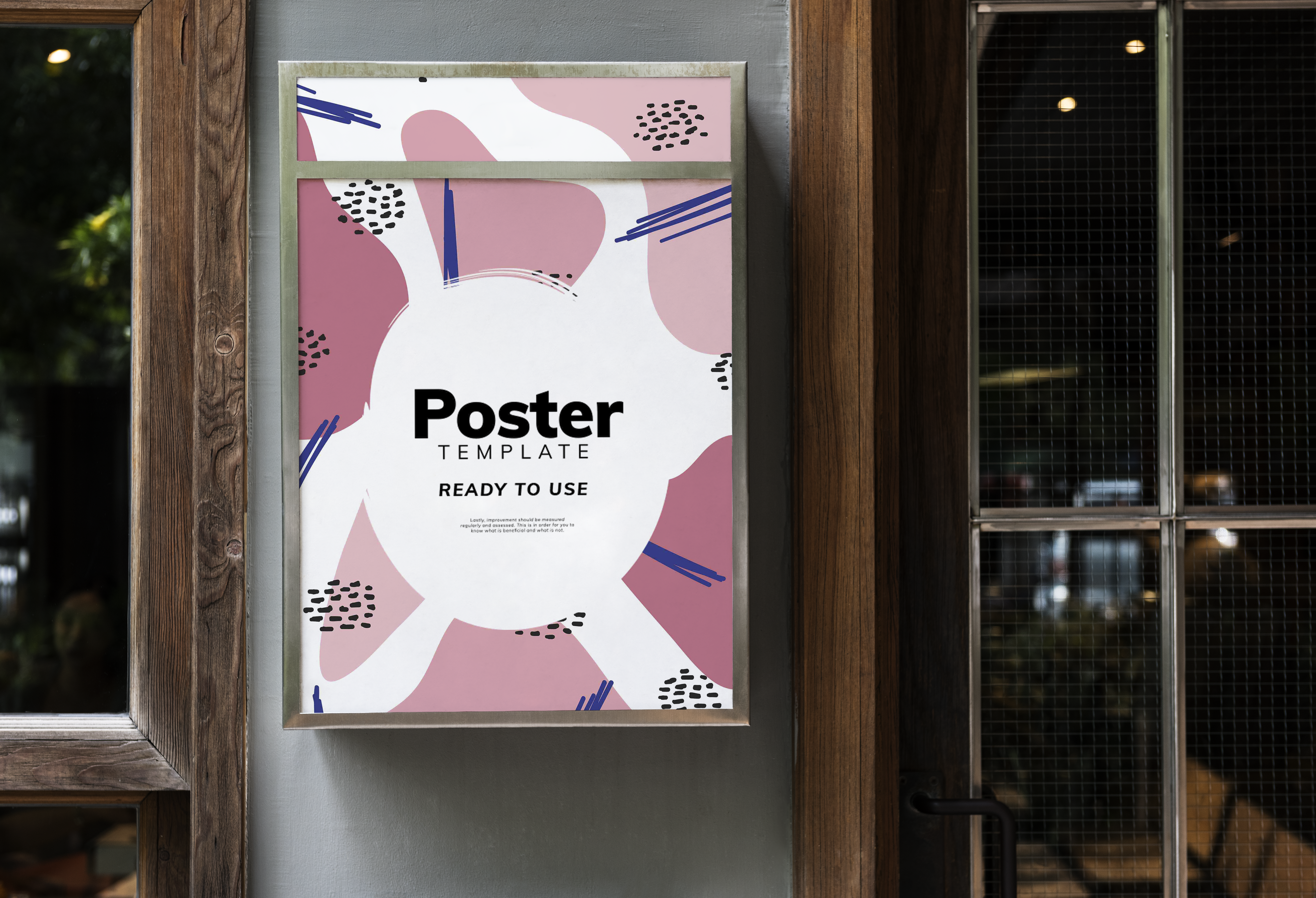 This mockup image features a vibrant poster displayed on a wall between a wooden-framed window and door, set against a cozy, dimly lit background. The poster has a modern, abstract design with pastel pink shapes, black patterns, and blue lines. Use this mockup to create eye-catching advertising materials for your business or event. Easily customize the poster with your own design and share it on social media to engage and attract your audience. Try our mockup generator today and showcase your creativity!