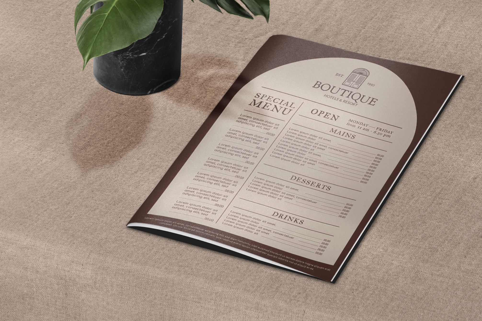 The mockup image features a neatly designed menu booklet placed on a beige fabric-covered table. The background includes a stylish black marble vase with green leaves, adding a touch of elegance. The primary design element is a sophisticated menu with a brown and cream color scheme, showcasing various restaurant offerings. This mockup is perfect for advertising restaurant menus, showcasing the classy and inviting atmosphere your establishment offers. Create your custom design now and share it on social media to attract more customers!