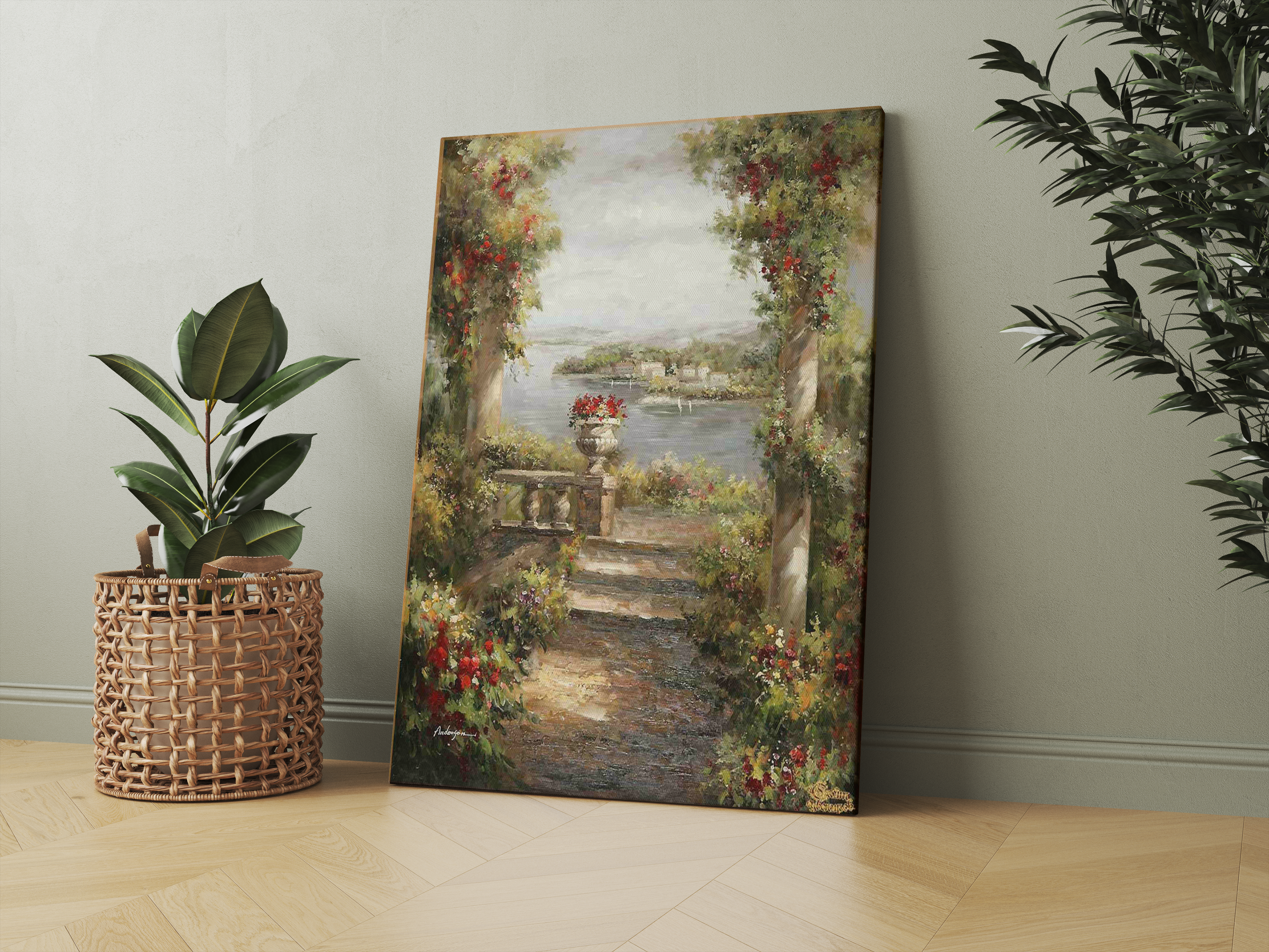 The mockup features a vibrant painting leaning against a softly lit beige wall, flanked by lush green indoor plants in wicker baskets. The painting depicts a picturesque garden pathway leading to a lakeside view, detailed with colorful foliage and stone pillars. This mockup is ideal for advertising artwork in a serene home setting, perfectly showcasing the art’s potential for enhancing interior décor. Use our mockup generator to visualize your designs and share them on social media to captivate your audience!