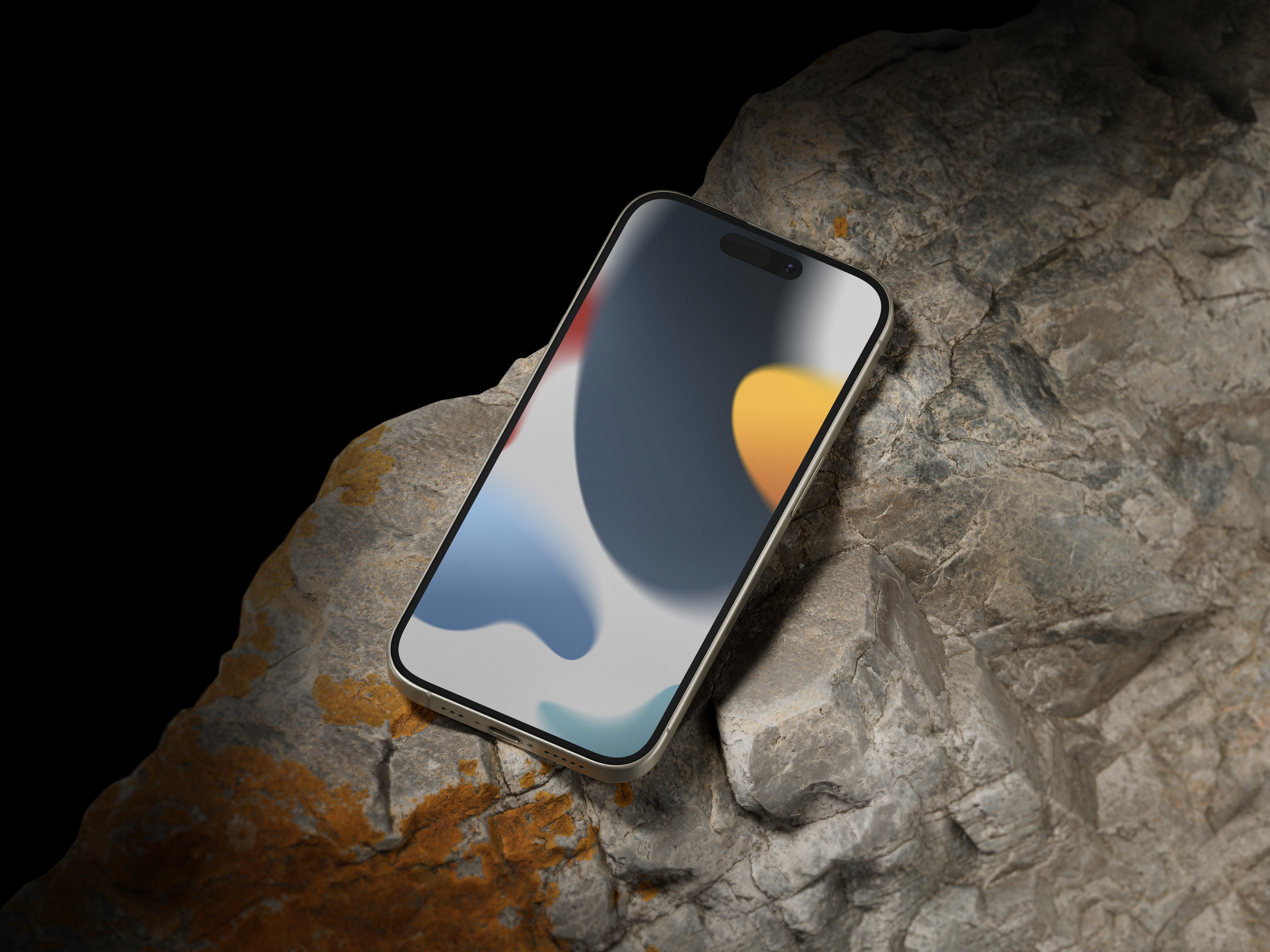The mockup image features a sleek smartphone placed on a rugged, rocky surface with a dark, minimalistic background. The smartphone screen displays abstract, colorful design elements, creating a striking contrast with the natural stone texture. This mockup is perfect for showcasing mobile app designs or wallpapers. Utilize this mockup to highlight your digital projects and advertise effectively. Try out the mockup generator today and share your stunning designs on social media!