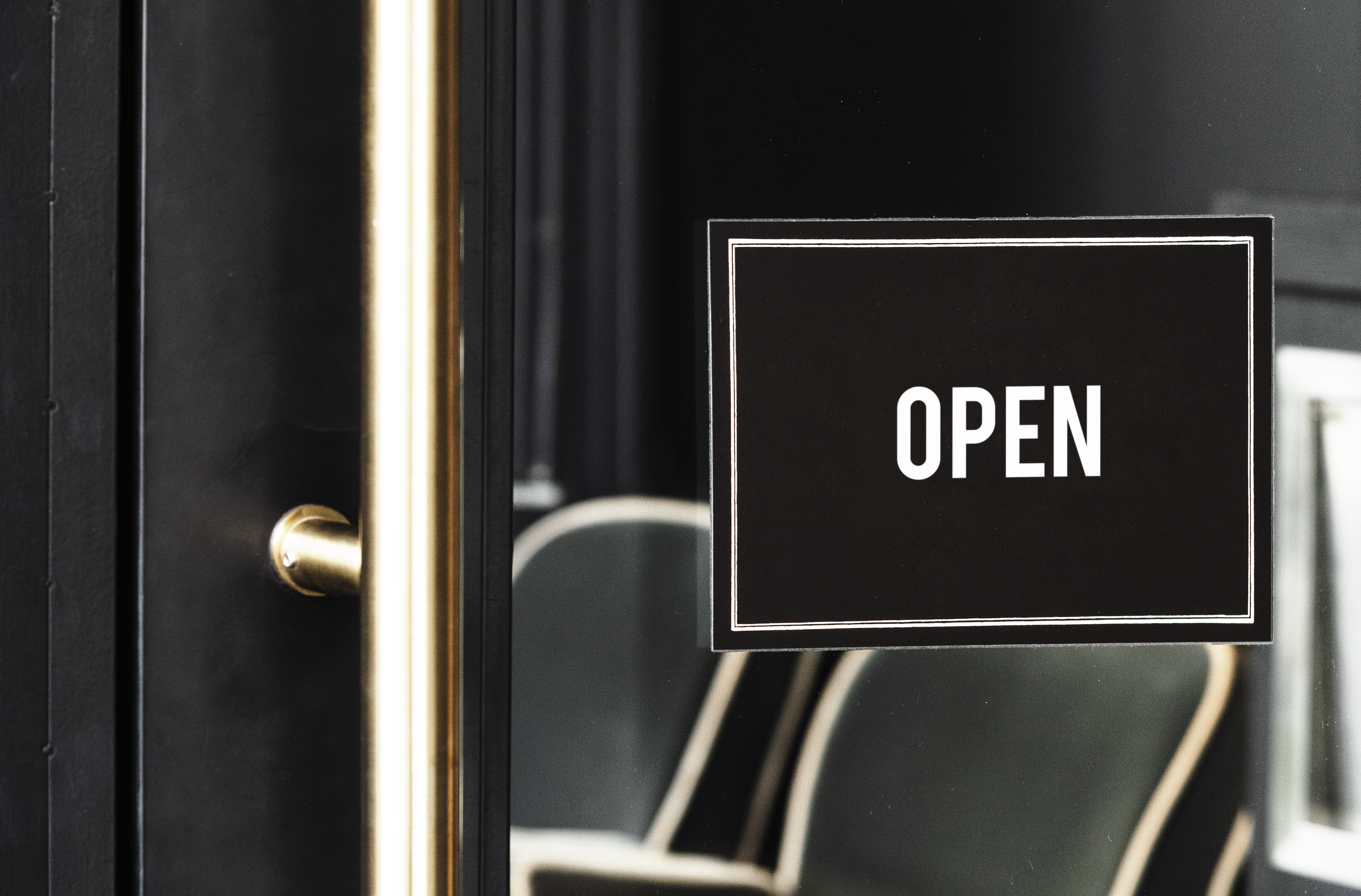 The image showcases a mockup of an "OPEN" sign on a glass door, set against a sleek, modern background. A gold door handle adds a touch of elegance. Utilize this mockup to design your custom signs for stores, offices, or events, seamlessly integrating your brand message. Use our mockup generator to personalize your design and share it on social media to attract customers now!