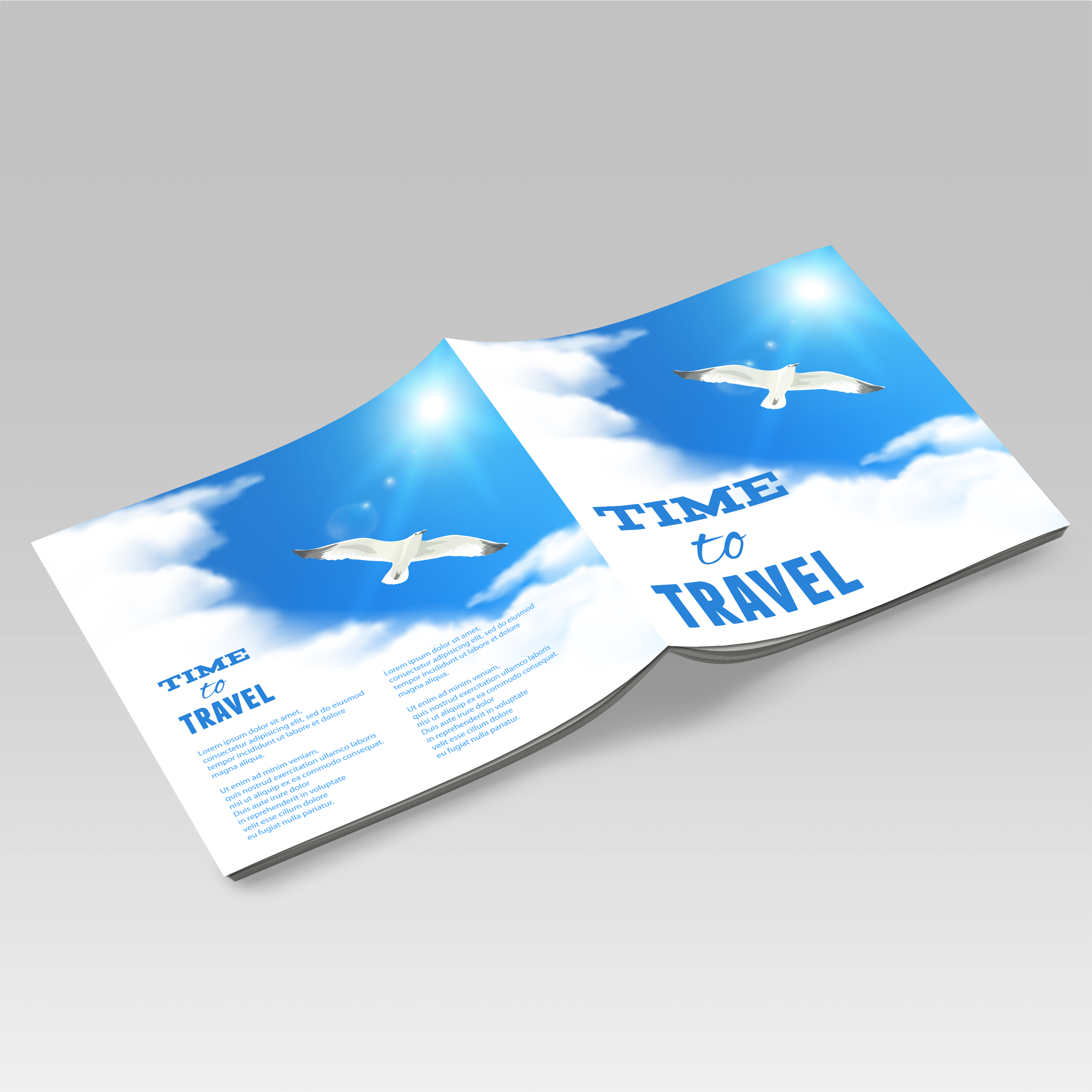This mockup features an open book with a travel-themed design. The background is a simple gradient, putting the focus on the book. The main image showcases a seagull against a blue sky with fluffy white clouds, symbolizing freedom and exploration. Use this mockup for advertising travel guides, brochures, or magazines. Create your own design with our mockup generator and share it on social media to attract attention and inspire wanderlust. Start designing today and captivate your audience with stunning visuals!