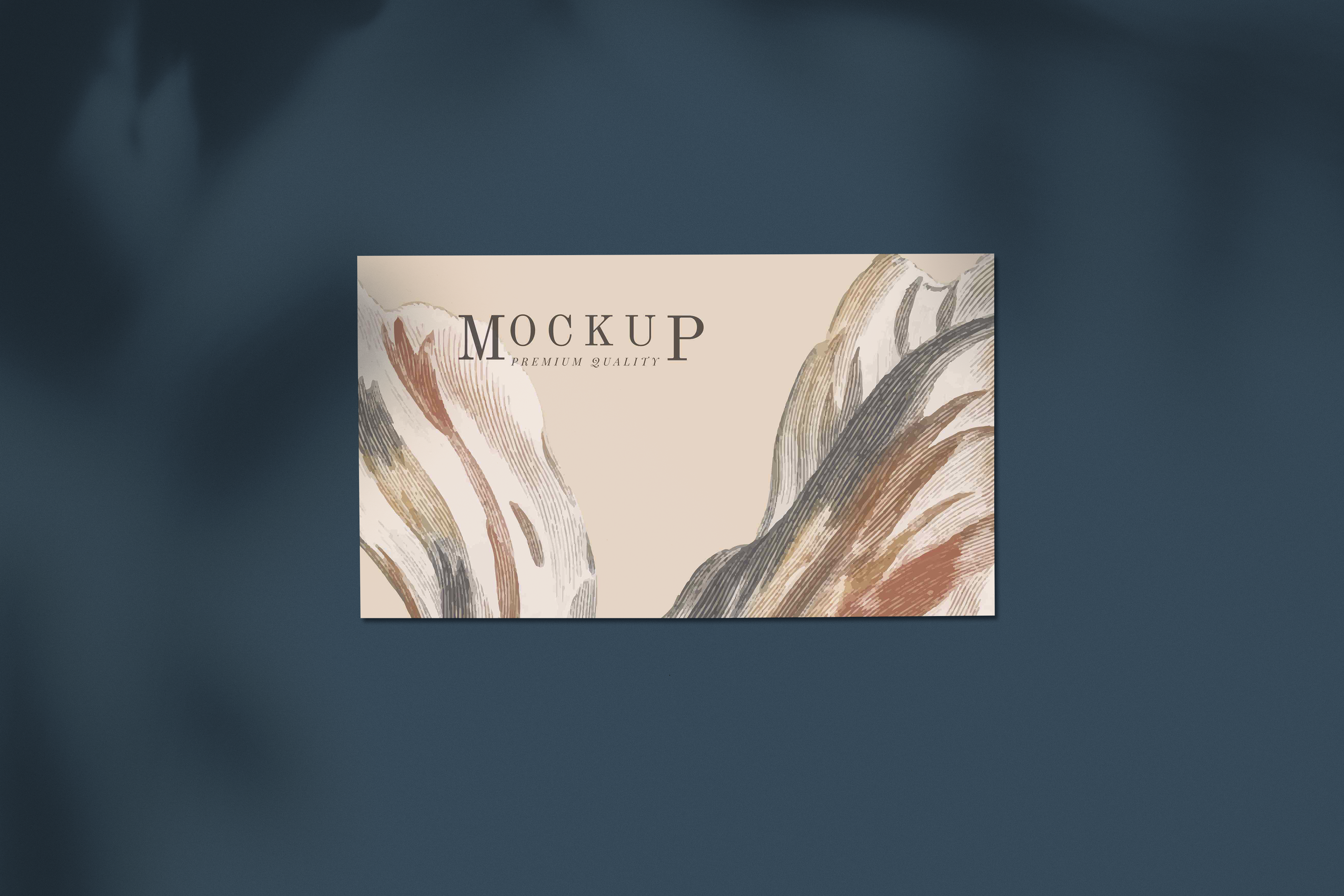The mockup features a rectangular card with an abstract, hand-drawn mountain illustration. The background is a deep blue, adding a sophisticated and elegant touch. The main object—the card—features muted earth tones such as brown, beige, and gray. It's perfect for showcasing art, invitations, or branding materials. Use this mockup to advertise your designs, create eye-catching presentations, and visualize your projects in style. Try our mockup generator now and share your stunning designs on social media!