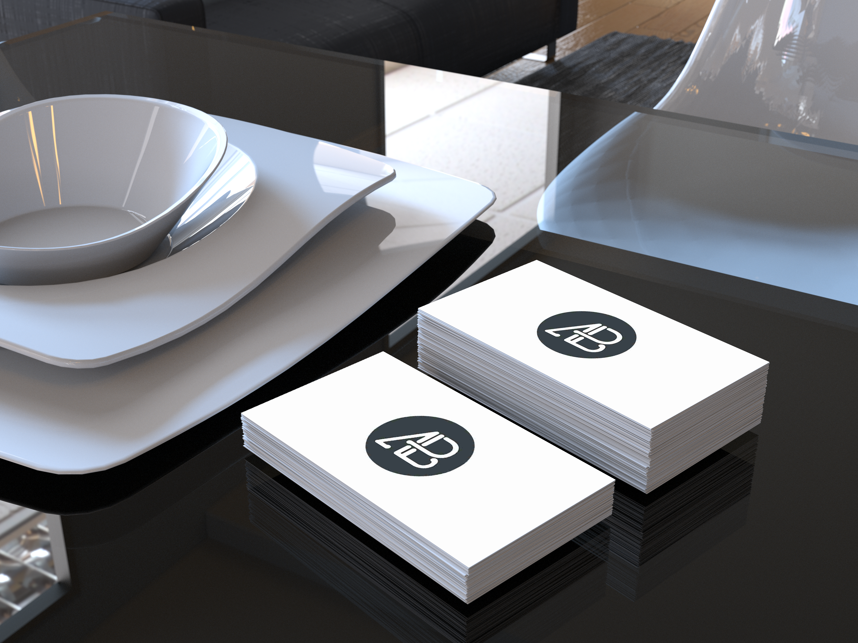 This mockup depicts two stacks of business cards on a sleek, glossy black surface in a modern setting, perhaps a kitchen or dining area. The background features elegant dinnerware with a grey, glossy finish, adding a professional and sophisticated touch. The business cards, white with a minimalist logo design in black, are prominently displayed. This mockup is ideal for advertising professional services or corporate branding. Use the mockup generator today and share your stunning design on social media!