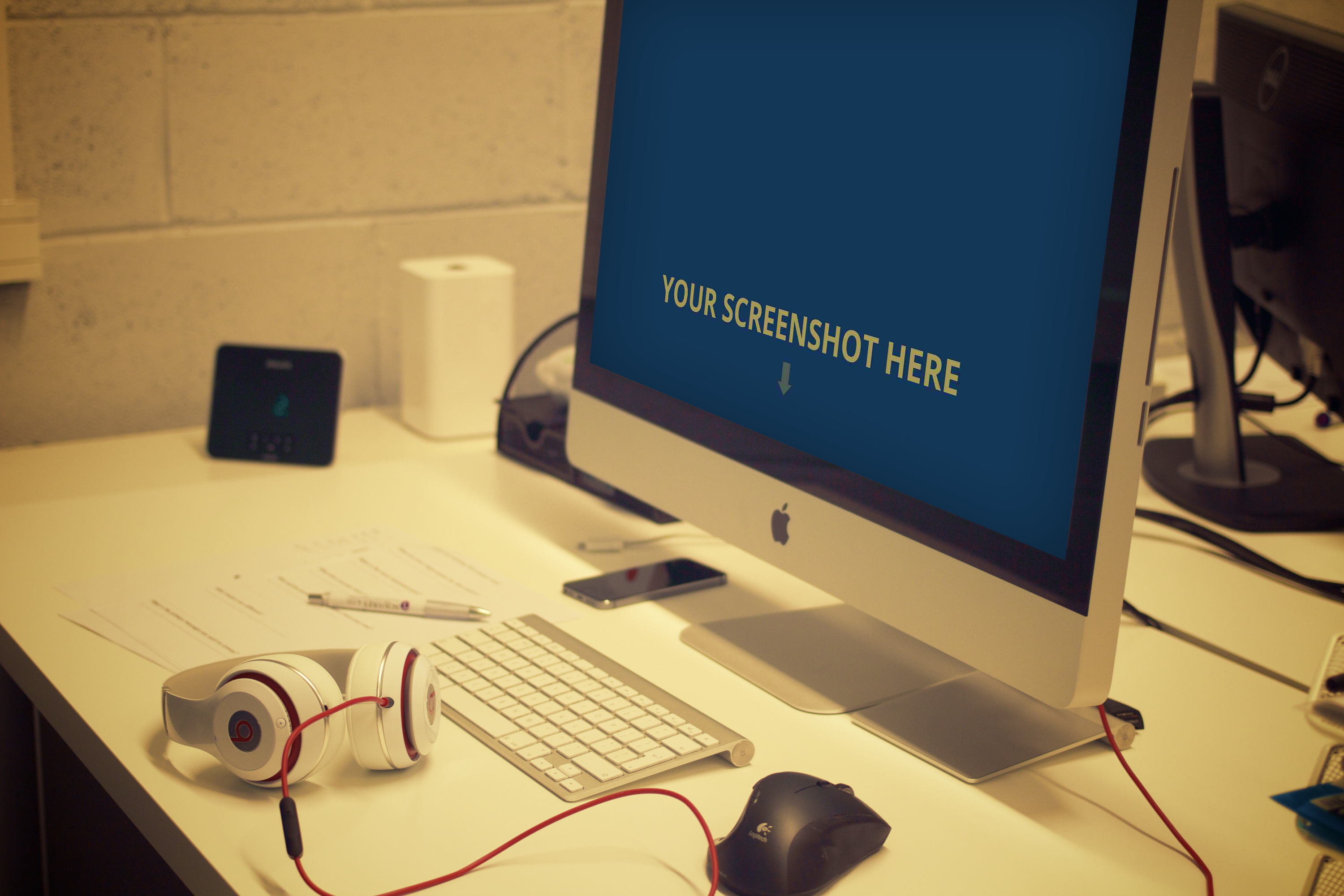 The mockup image captures a modern office setting with a clean, white desk against a textured, light grey wall. The main object is an Apple desktop computer displaying a placeholder for a screenshot. Design elements include a wireless keyboard, a mouse, and a pair of white headphones neatly placed nearby. Use this mockup to showcase software, websites, or digital designs effectively. Create your visualization using our mockup generator and share your design on social media to captivate your audience!