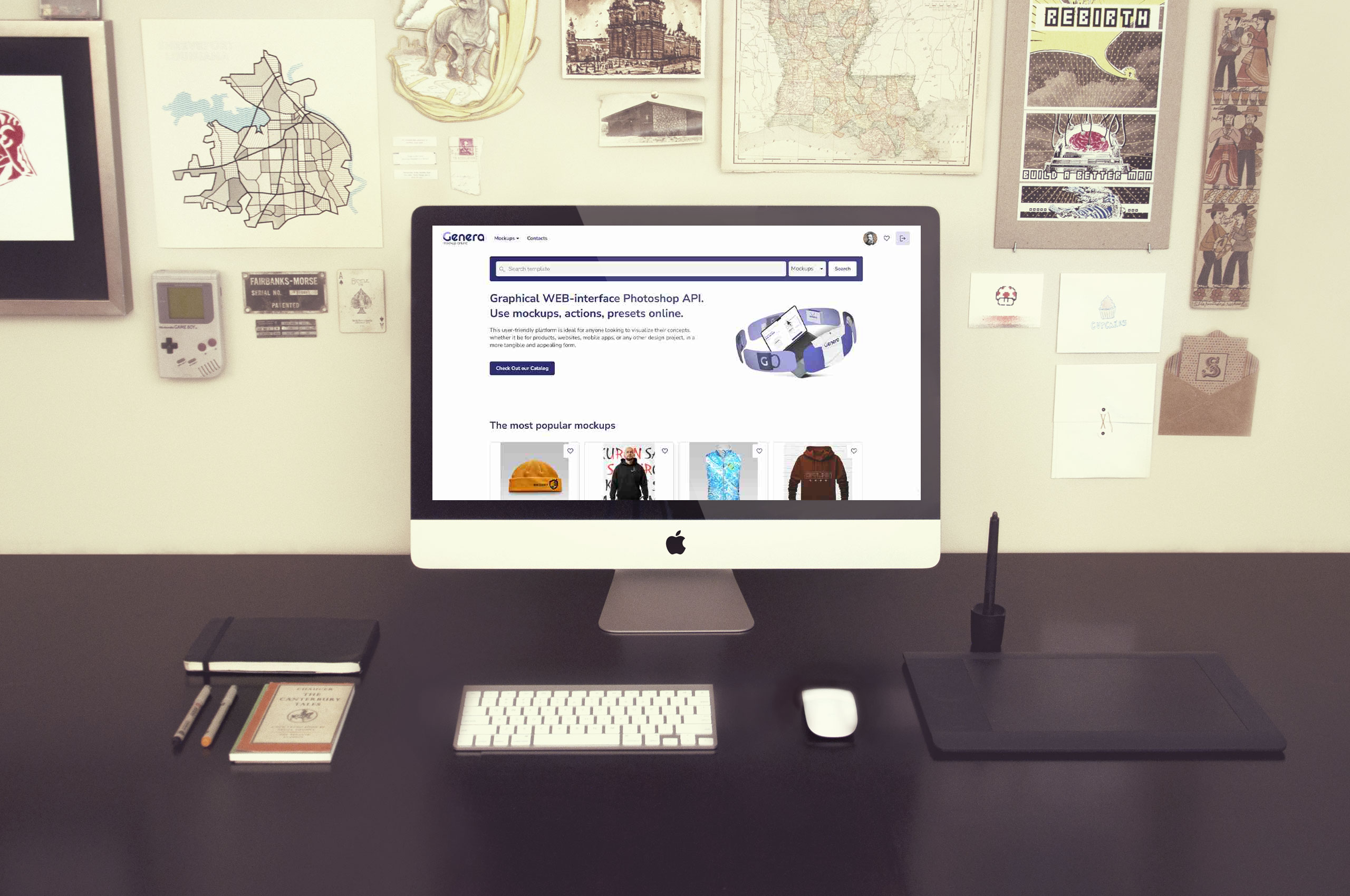 The mockup image features a clean, modern workspace with a sleek white iMac centered on a dark desk. Surrounding the computer are a keyboard, mouse, graphic tablet, notebooks, and pens. The background consists of a beige wall adorned with various maps, drawings, and inspirational prints. Several personal mementos contribute a creative, organized vibe.
