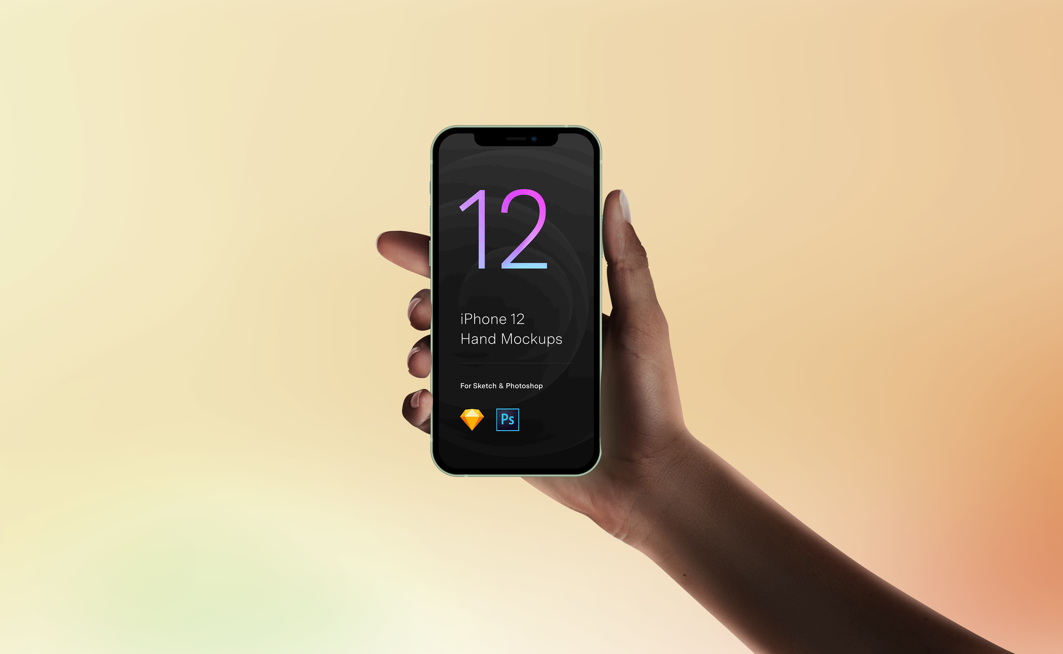 The mockup image features a hand holding an iPhone 12 against a soft gradient background blending pastel yellow and peach. The iPhone screen displays an in-app design interface with vibrant graphics. This mockup is perfect for advertising mobile apps, showcasing new UI designs, or promoting custom wallpapers. Use the mockup generator now to create captivating visuals and share your innovative designs on social media for maximum engagement. Create, share, and impress!