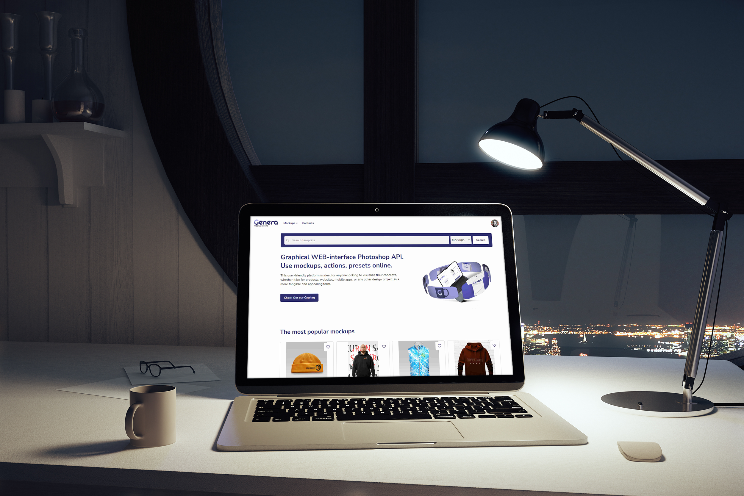 The mockup image showcases a modern workspace with a sleek laptop as the main object. The background features a large window with a panoramic cityscape and night lights, adding a polished touch. Design elements include a desk lamp casting focused light, a coffee mug, and eyewear, reflecting a productive environment. This mockup is perfect for advertising tech products, design services, or productivity tools. Use the mockup generator to create your design and share it on social media to captivate your audience!