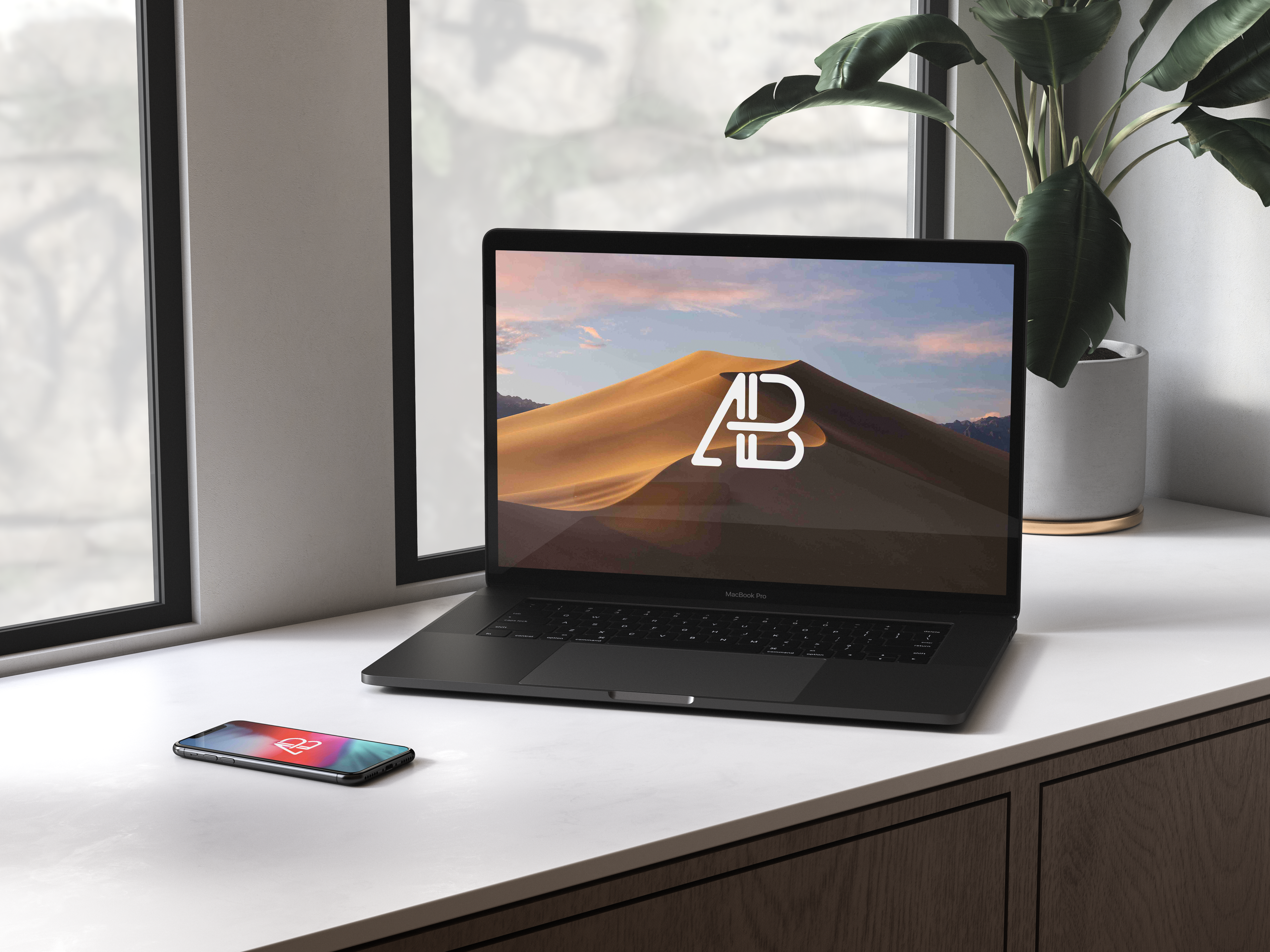 The mockup image shows a sleek workspace with a large window in the background. On a white countertop, a laptop displaying a minimalist desert-themed wallpaper and an adjacent smartphone are placed. A potted plant adds a touch of greenery. The setting is bright, modern, and clean, creating a professional and inviting atmosphere. This mockup is perfect for showcasing digital products or designs. Use our mockup generator to bring your vision to life and share your stunning creations on social media today!