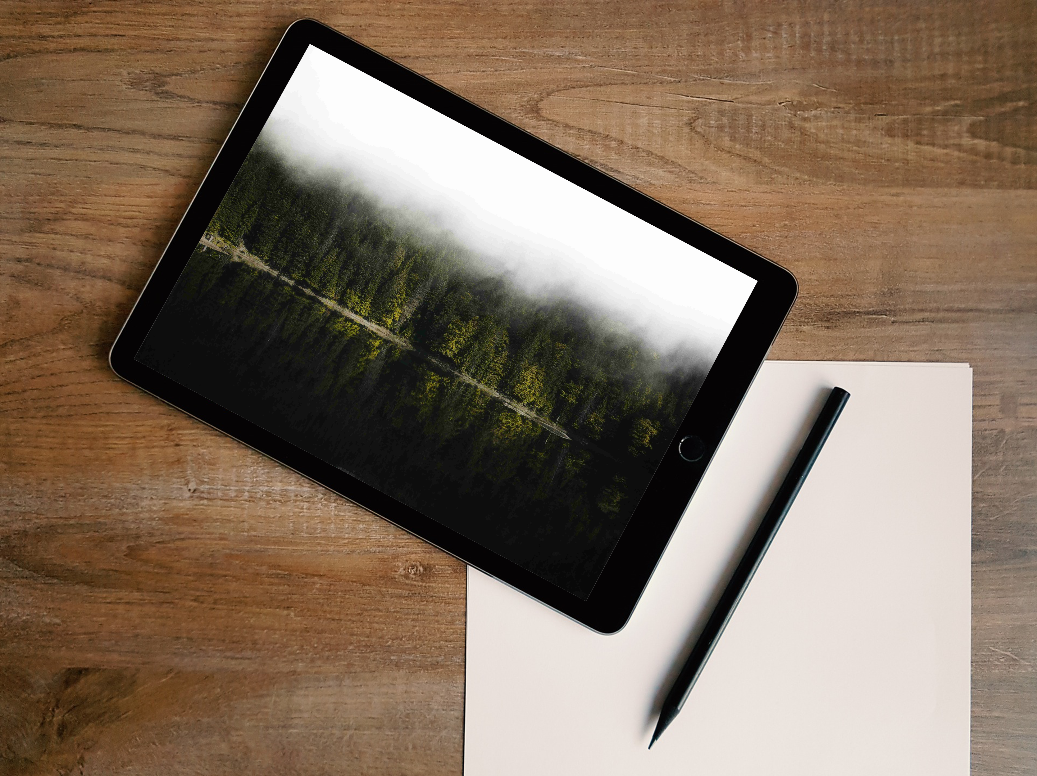 The mockup features a black tablet displaying a foggy forest scene, set on a wooden table. Next to the tablet is a blank sheet of paper and a sleek black pen. The setting evokes a natural, rustic ambiance perfect for showcasing digital designs. Utilize this mockup to enhance your advertising campaigns by visualizing your app or website in an organic setting. Use the mockup generator now and share your captivating designs on social media for maximum impact!