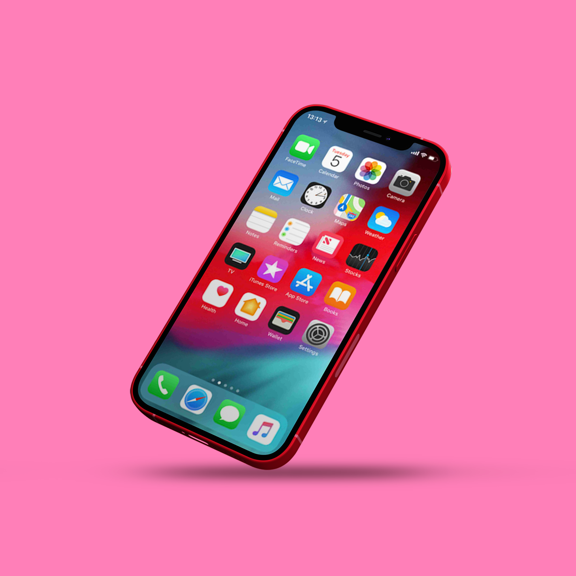 The mockup showcases a sleek smartphone set against a vibrant pink background. The phone, in a red case, displays a colorful home screen with various app icons. Prominent design elements include a notch at the top and a clean, modern interface. This mockup is perfect for advertising mobile apps or phone accessories. Use this mockup generator to create stunning visuals and share your design on social media for maximum impact.