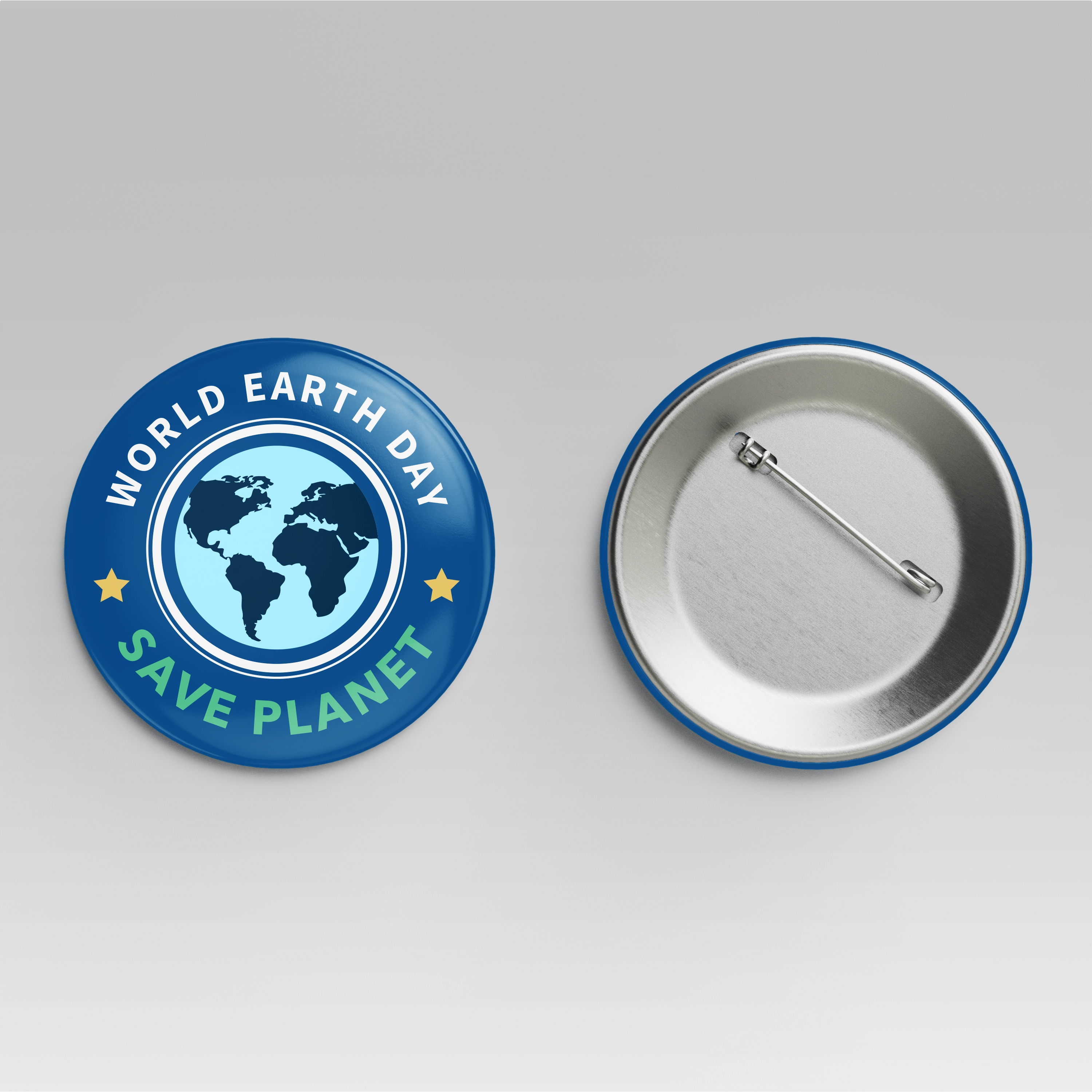 The mockup image features two pin buttons placed against a gradient background that transitions from light to dark gray. One button displays the front design, showcasing a prominent blue and green globe in the center, encircled by a darker blue border with yellow star accents. The outermost ring is a vibrant blue with white and green text, complemented by a clean, shiny finish. The second button reveals the backside, highlighting its metallic finish and safety pin mechanism.