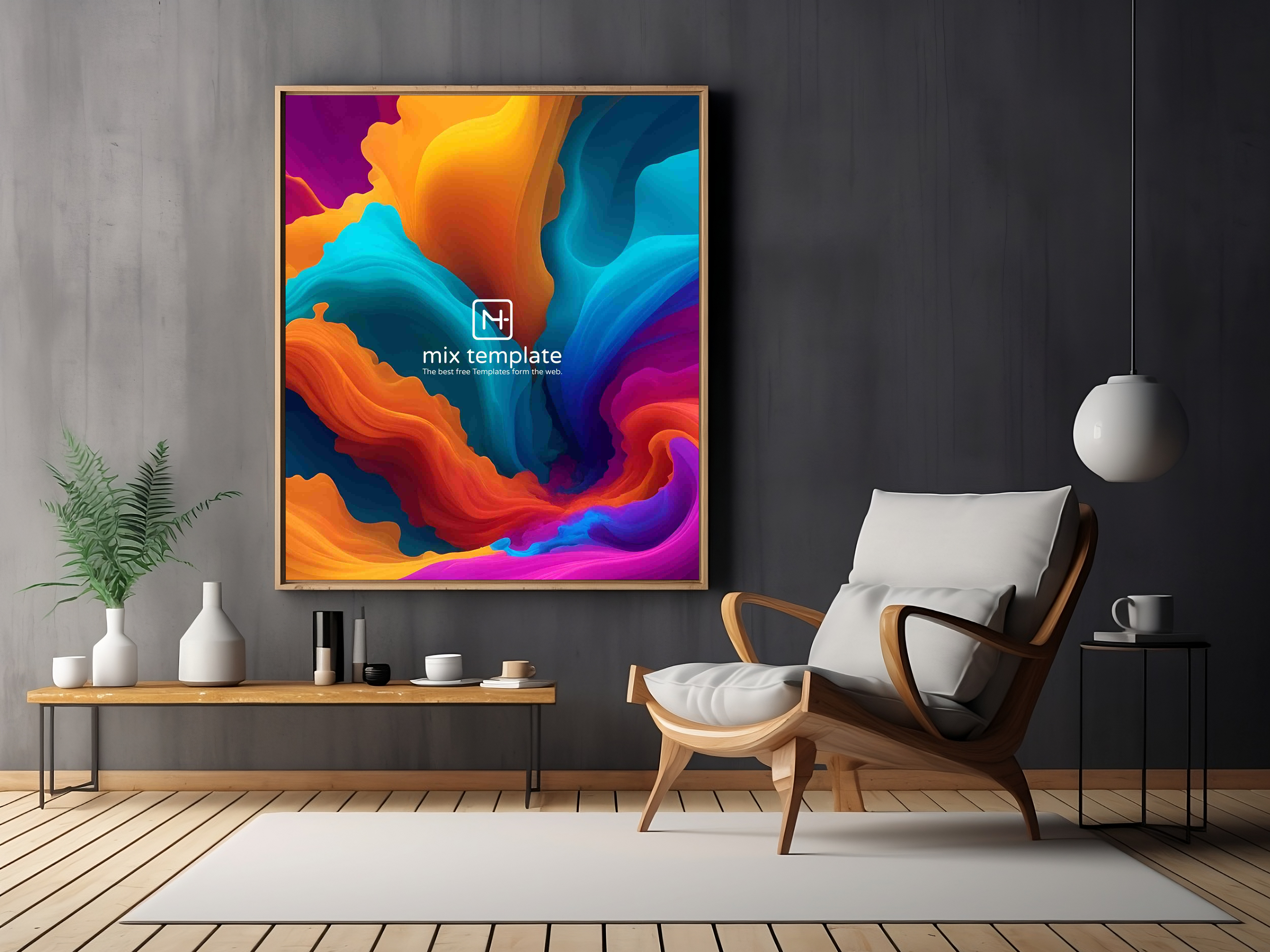 The mockup showcases a modern living room with a sleek, dark wall background. At the center is a vibrant, framed artwork featuring a colorful, abstract design with bold swirls of orange, blue, and purple. The setting includes a cozy wooden armchair with white cushions, a minimalistic side table, and decorative vases and plants on a wooden bench. Use this mockup to visually enhance your interior design advertisements. Try our mockup generator today and share your stunning designs on social media!