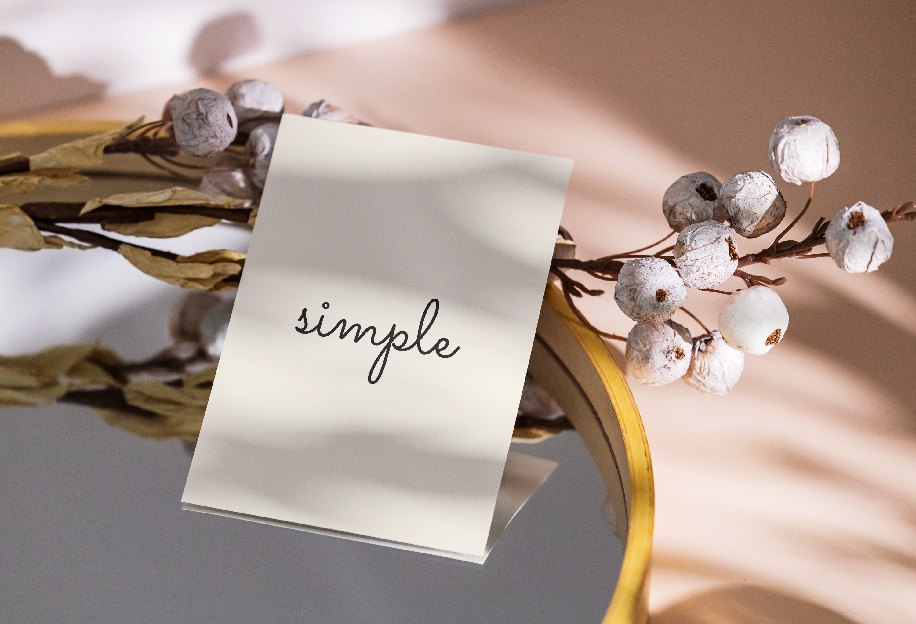 This mockup image features a minimalistic card resting on a reflective surface, accented by dried botanicals. The neutral tones and soft lighting create a serene atmosphere. The card prominently displays a simple design, ideal for showcasing elegant and understated brand messages. Use this mockup to advertise greeting cards, event invites, or personal messages. Tap into the benefits of our mockup generator and share your unique designs on social media for maximum engagement!