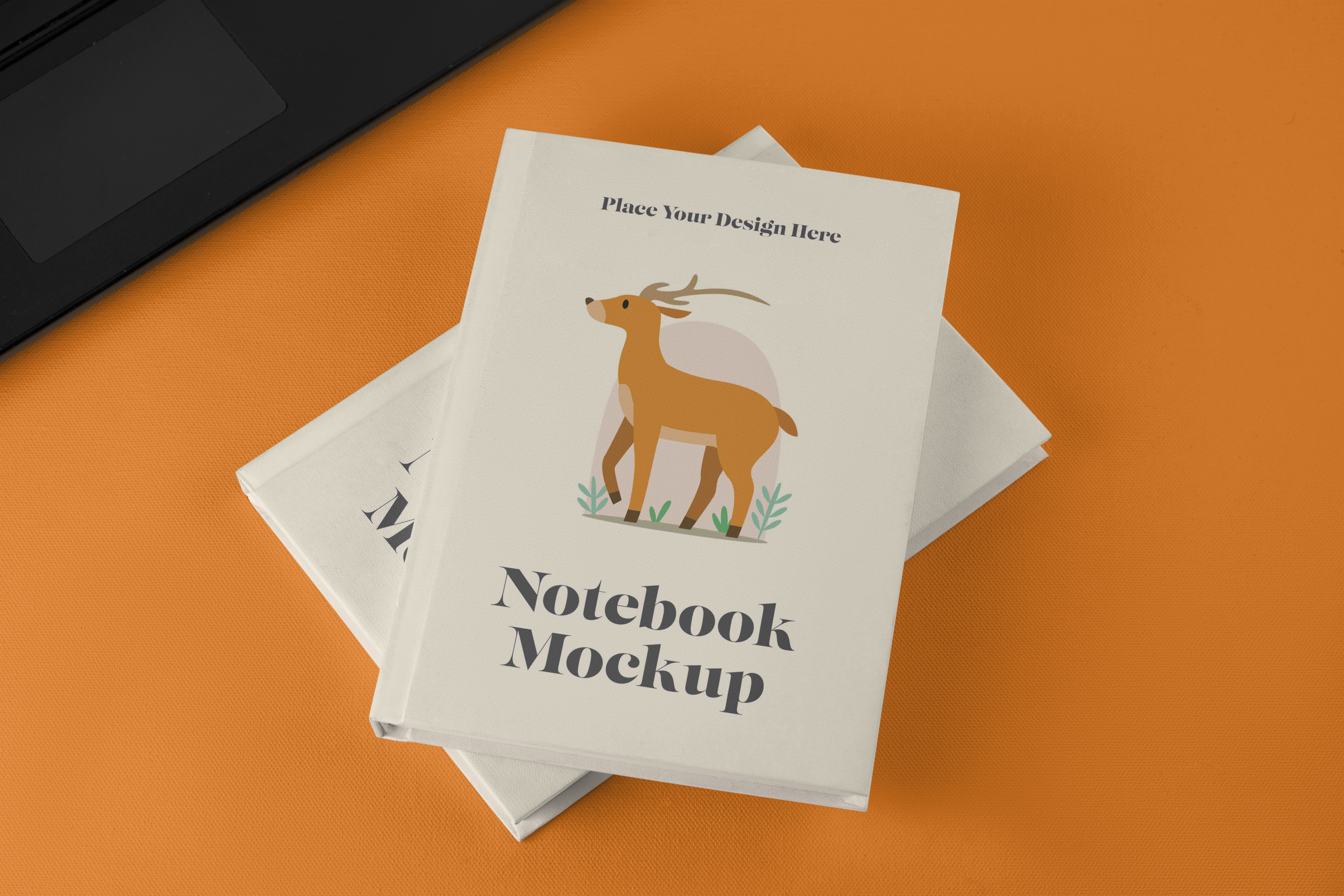 The mockup image features a neatly arranged workspace with an orange background, a closed laptop, and two stacked notebooks. The top notebook showcases a minimalist design with a deer illustration and text elements. This mockup is ideal for advertising custom notebook designs, allowing users to visualize their artwork in a professional setting. Use this mockup generator to create stunning notebook designs and share your creations on social media to gain visibility and attract potential customers!