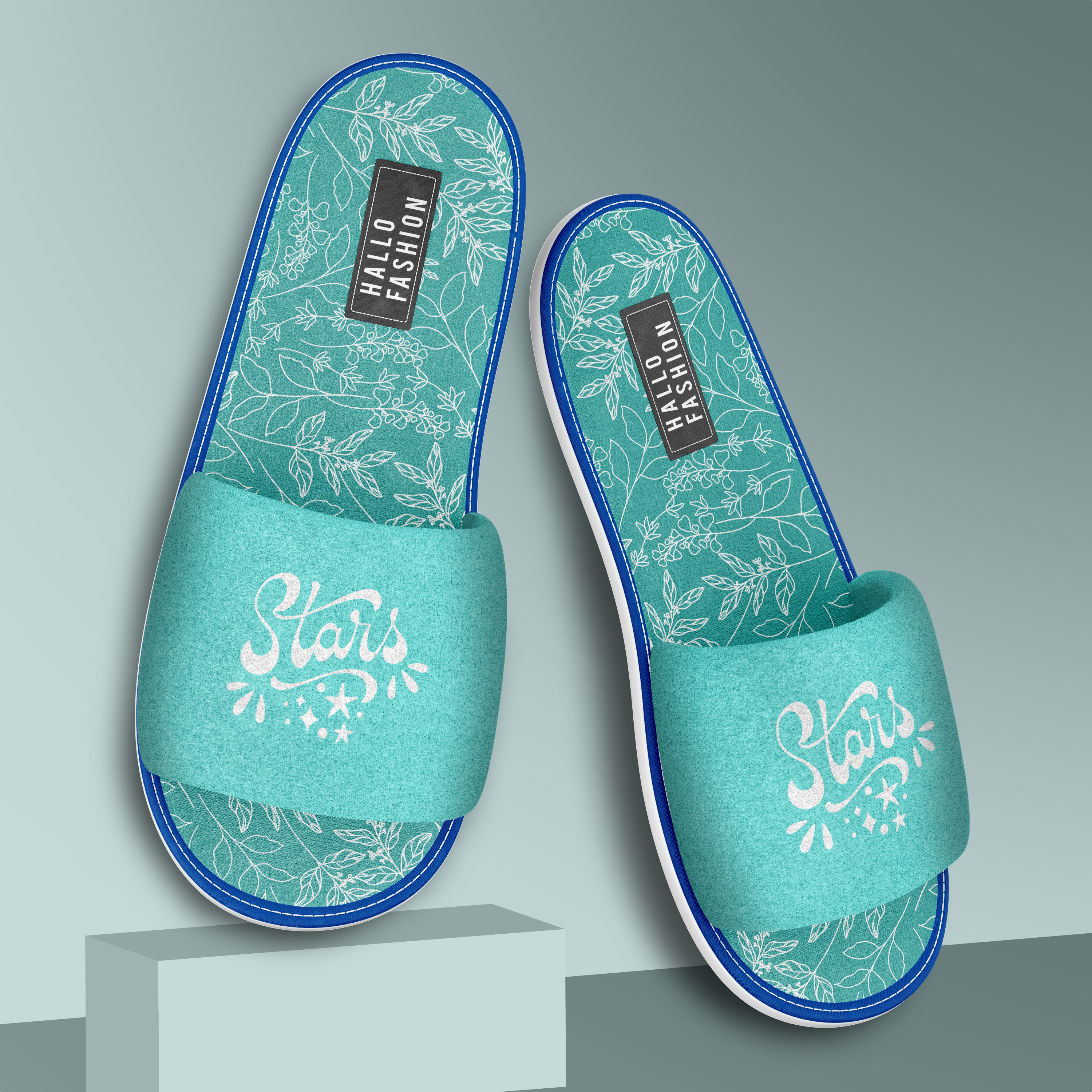 The mockup image showcases a pair of stylish slippers against a minimalistic, gradient background in shades of teal and gray. The slippers feature a turquoise color with a white floral pattern printed on the insole and the word "Stars" decorated with small stars on the straps. The design elements create a fresh and trendy look. Utilize this mockup for advertising fashionable footwear collections. Try the mockup generator now to design your unique slippers and share your creations on social media!