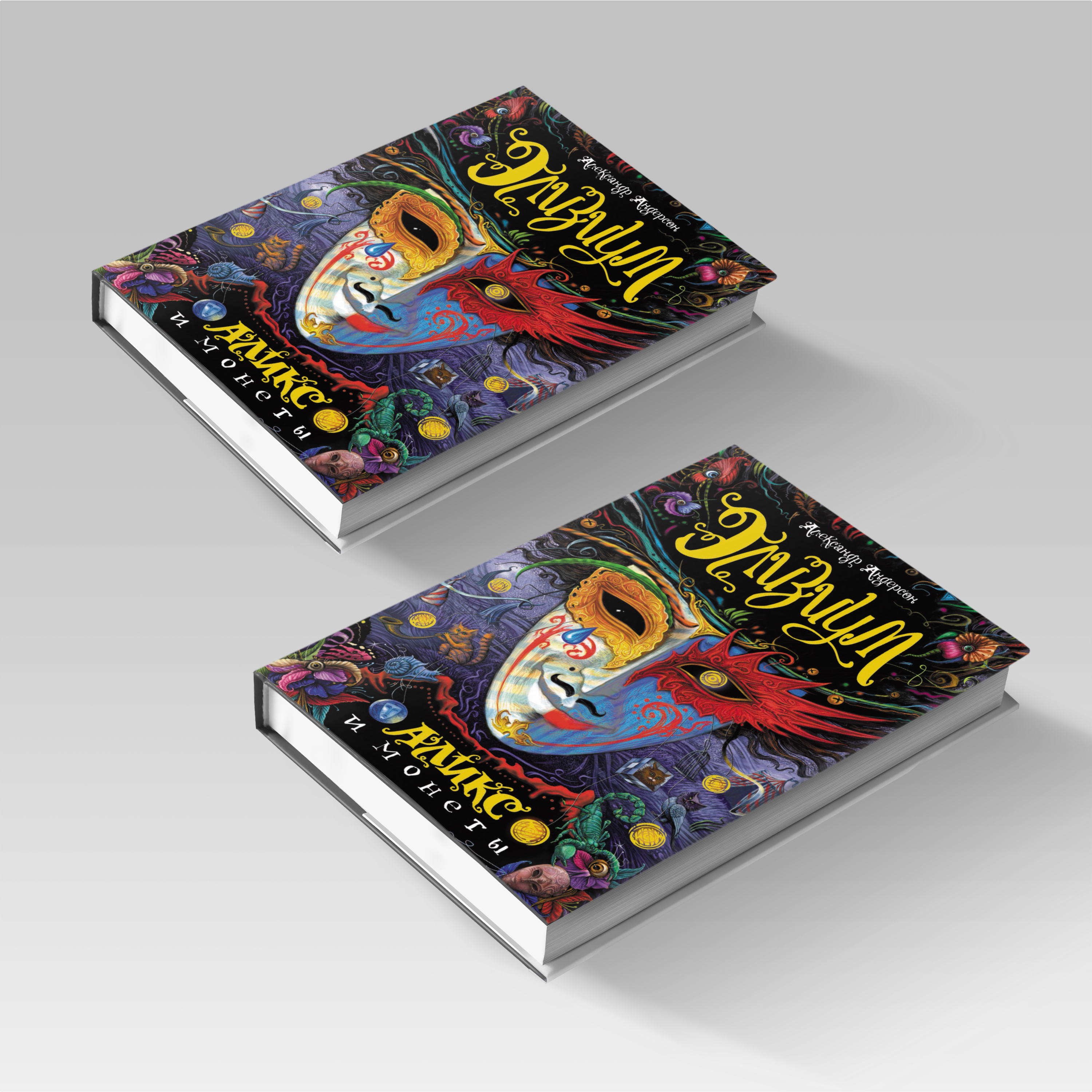 The mockup features two hardcover books on a light gray background. Each book displays a vibrant, detailed cover with a colorful mask surrounded by intricate patterns and elements. This mockup can highlight book cover designs for advertisements, showcasing the appeal of your book visually. Use our mockup generator to bring your unique book cover to life, and share your stunning design on social media to captivate your audience and boost your book's visibility!