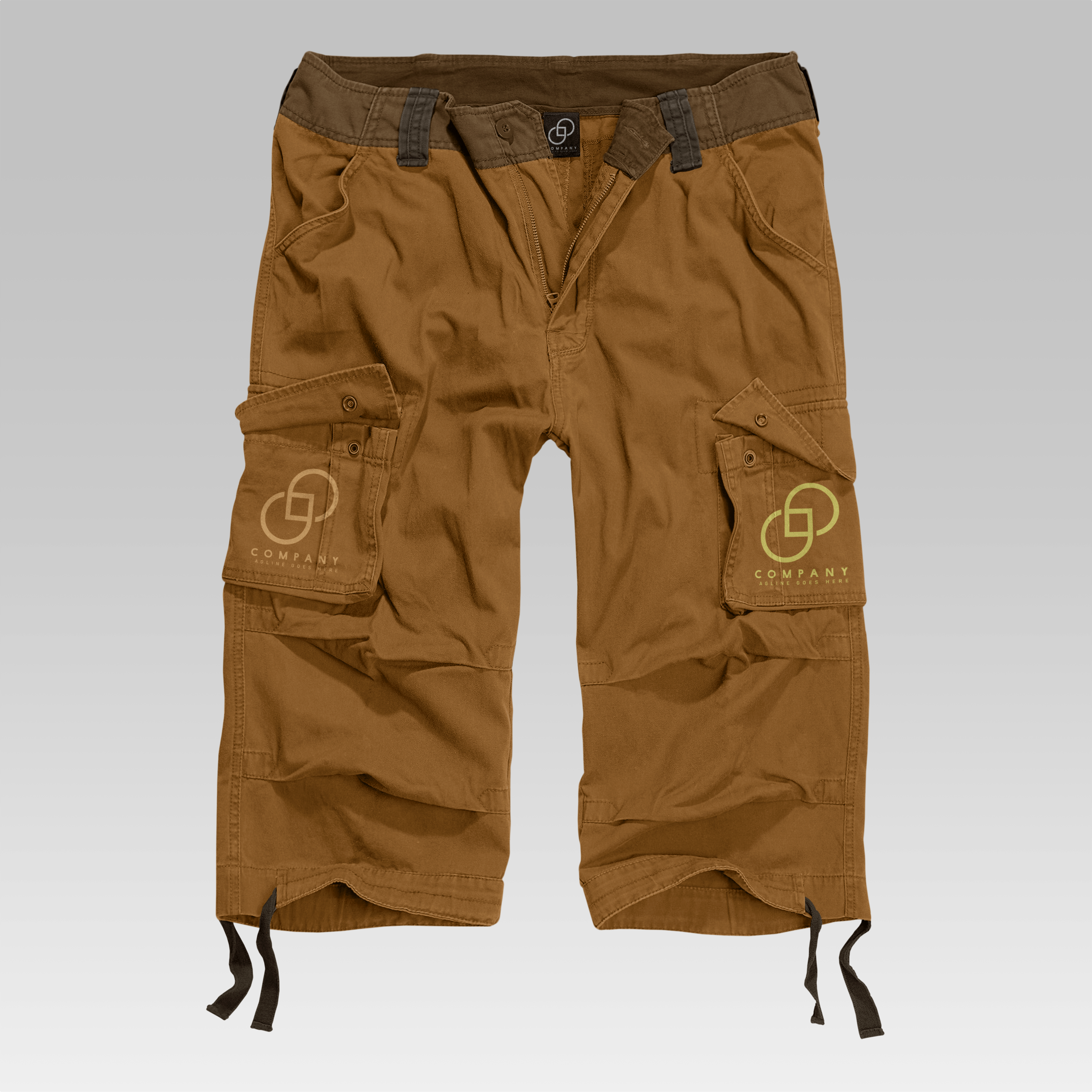 On the cargo pockets, particularly on the left and right sides, there are company logos prominently displayed. This branding enhances the look of the shorts and is an eye-catching design feature. These logos are a combination of a modern, intertwined geometric symbol followed by text in a clean sans-serif font, adding a sense of professionalism to the casual attire.