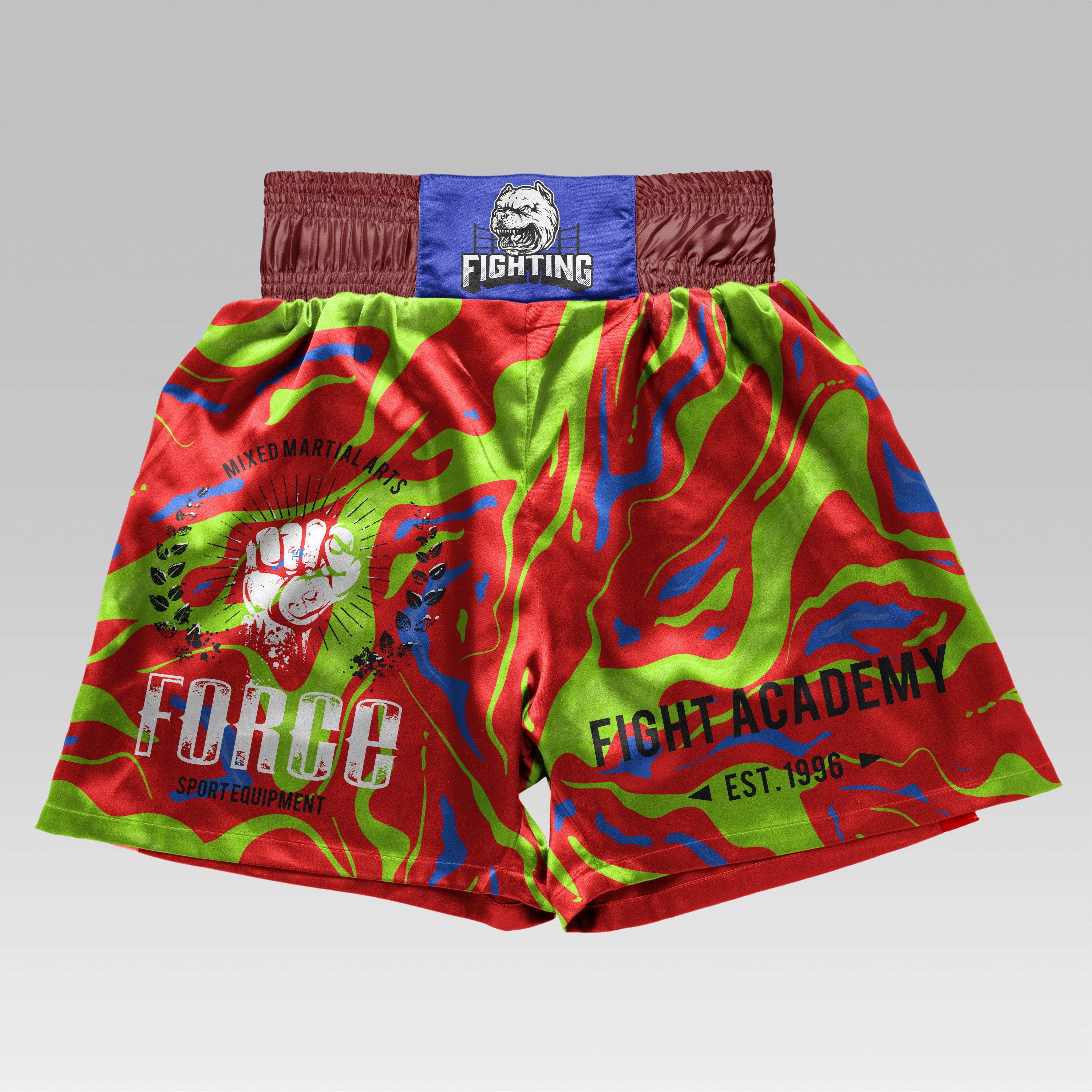 The image features a colorful pair of fighting shorts with a vivid, abstract design of red, green, and blue swirls. The background is plain grey, making the shorts the focal point. The shorts showcase various design elements, such as a graphic of a clenched fist and text, ensuring high visual impact. Use this mockup to promote your sports gear, highlighting its vibrant design and durability. Try the mockup generator today and share your custom designs on social media!