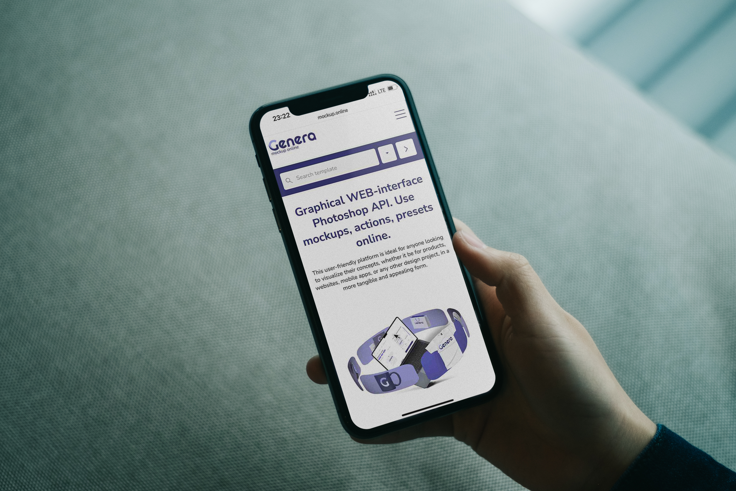 The mockup image shows a hand holding a smartphone in a modern, casual setting with a blurred background, possibly a couch with a simple texture. The screen displays a user-friendly website with graphical elements and a clean design. This versatile mockup can be used to advertise mobile apps, websites, or online services. Use this mockup generator to visualize and promote your design, and share your creation on social media to engage your audience!