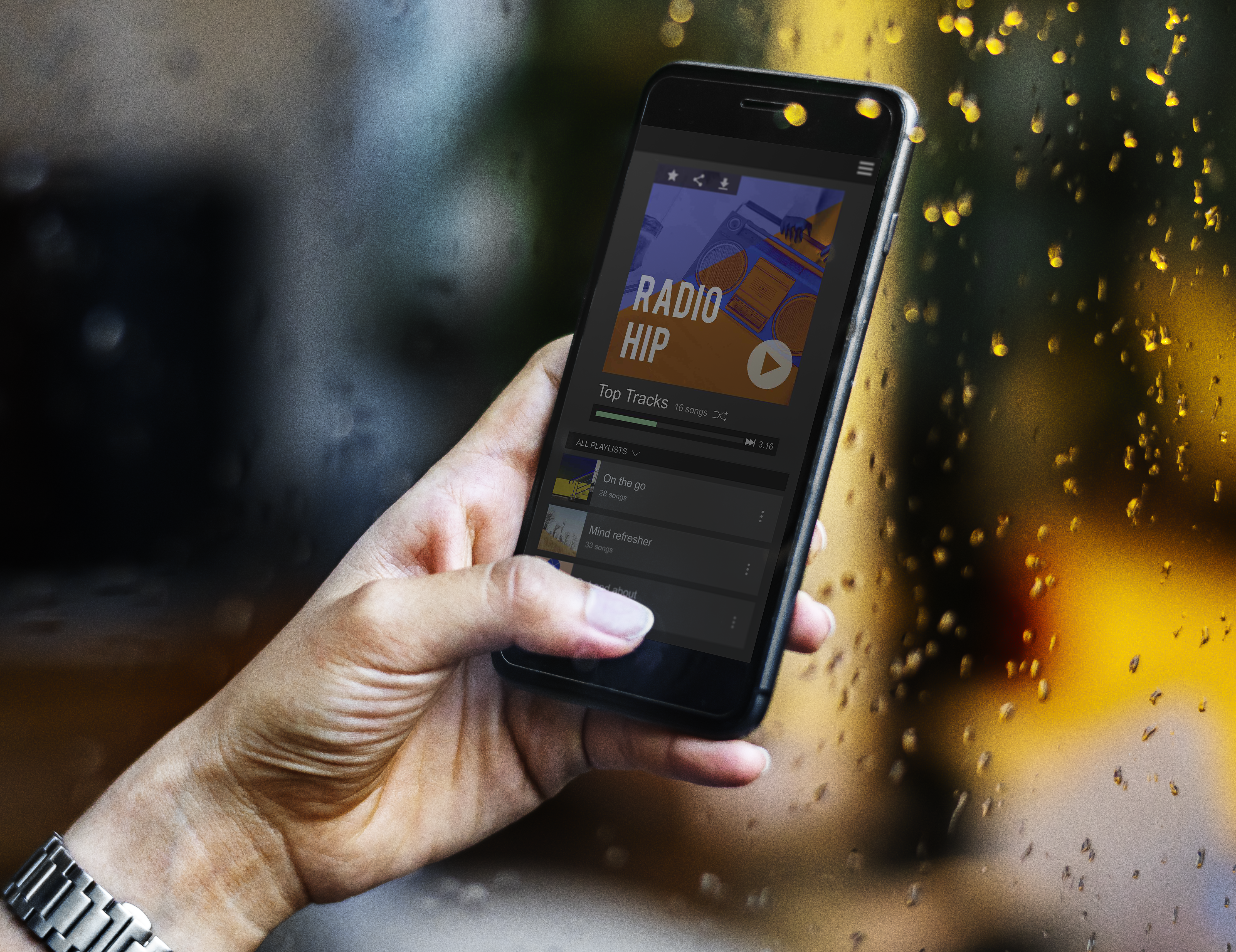 The mockup depicts a smartphone held by a person with a blurred, rainy window in the background, creating a cozy indoor ambiance. The screen displays a vibrant music app interface featuring album artwork, track list, and play button. This mockup effectively showcases mobile app designs for music or media platforms, ideal for advertisements. Leverage this realistic setting to visualize your app in everyday use. Use our mockup generator to create stunning visuals and share your design on social media today!
