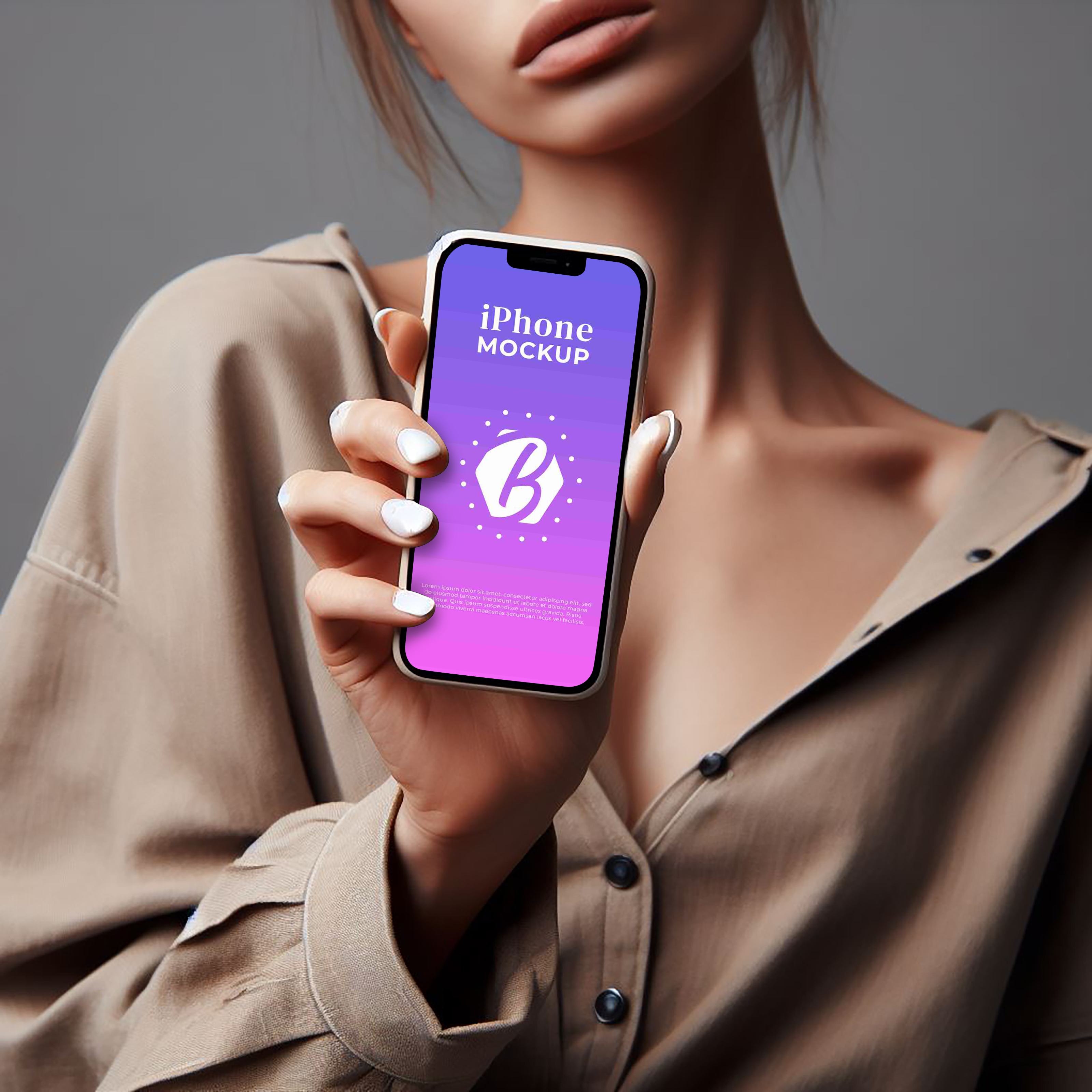 The mockup image features a woman holding an iPhone in a casual setting with a neutral grey background. The iPhone screen displays a purple and pink gradient design with a prominent white logo in the center. This visually arresting mockup can be utilized for advertising mobile apps, websites, or digital services. Generate your own design with this mockup generator and share your unique creation on social media to captivate your audience.