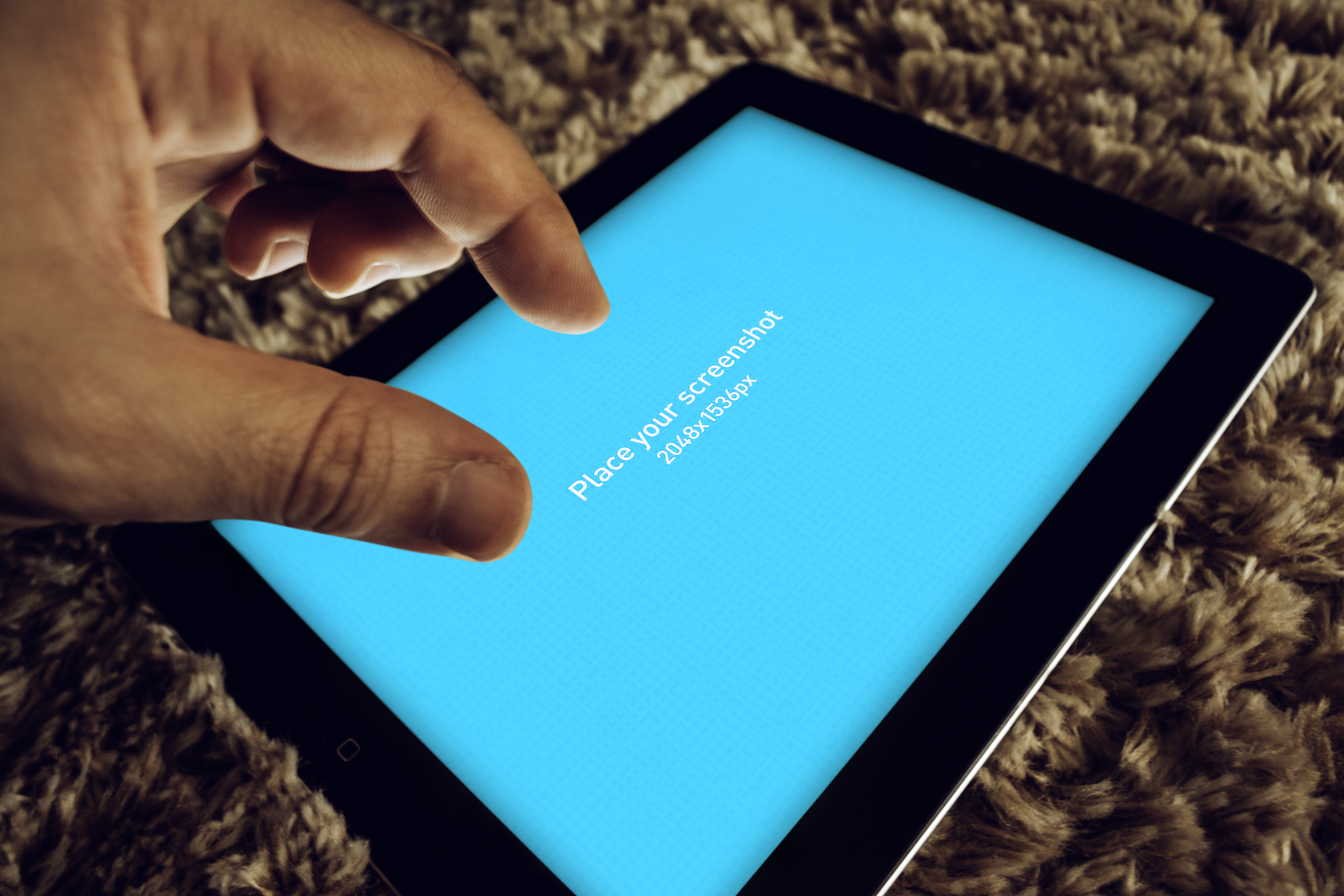 This mockup displays a hand interacting with a tablet, placed on a textured, fluffy carpet. The tablet screen is illuminated with a sleek blue background, providing a space to insert a custom screenshot. The design elements are clear and modern, making it ideal for showcasing app interfaces or digital content in a relatable, everyday setting. Use this mockup for advertising your apps, e-books, or media. Get creative with our mockup generator and share your unique design on social media today!