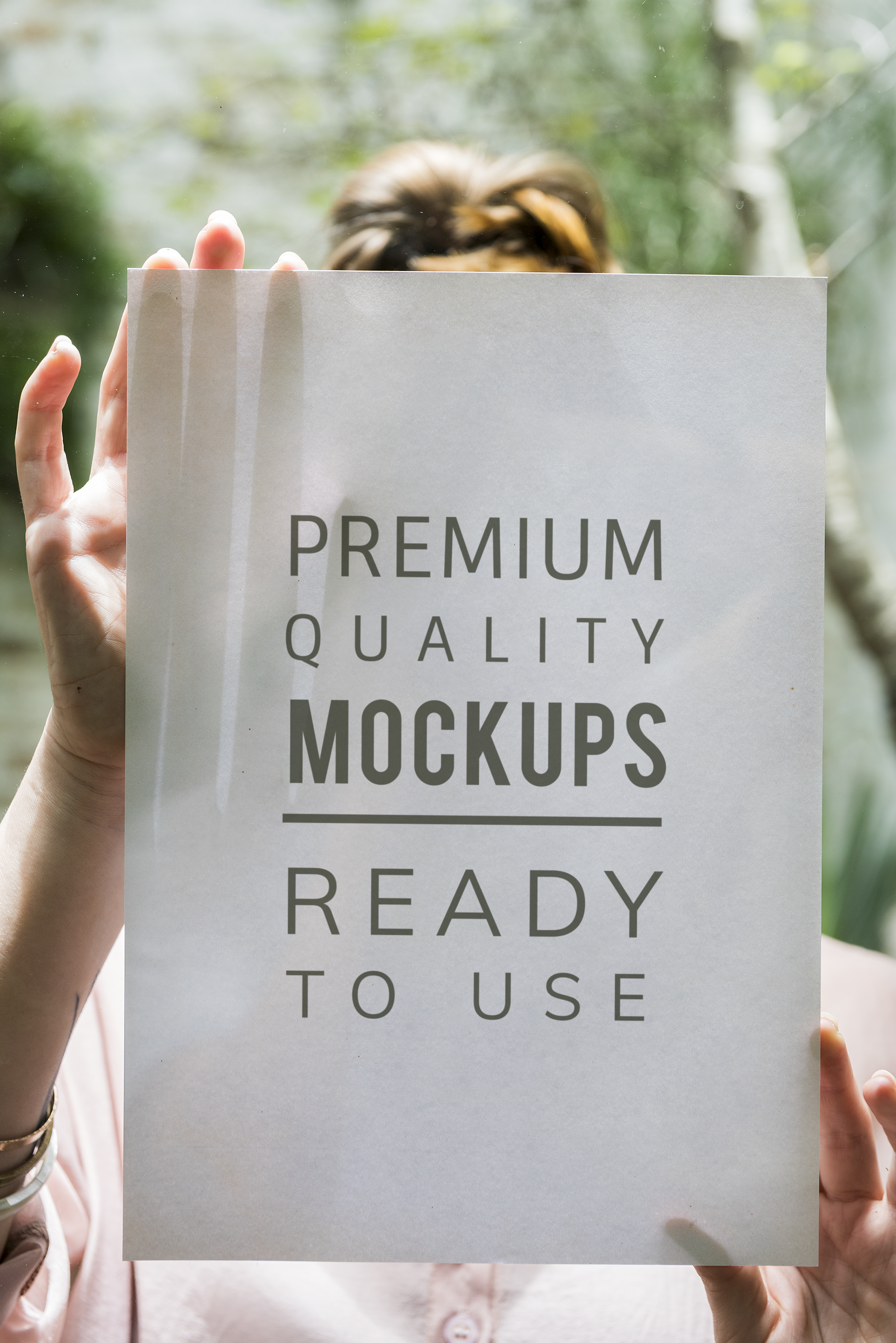 The mockup image features a person holding a transparent sheet with printed design elements against a soft, blurred natural background. The sheet has neatly arranged text that stands out prominently. This mockup is ideal for showcasing your artwork or promotional text in a realistic setting, enhancing your advertising reach. Use our mockup generator today to create eye-catching designs and share them on social media to captivate your audience and drive engagement!