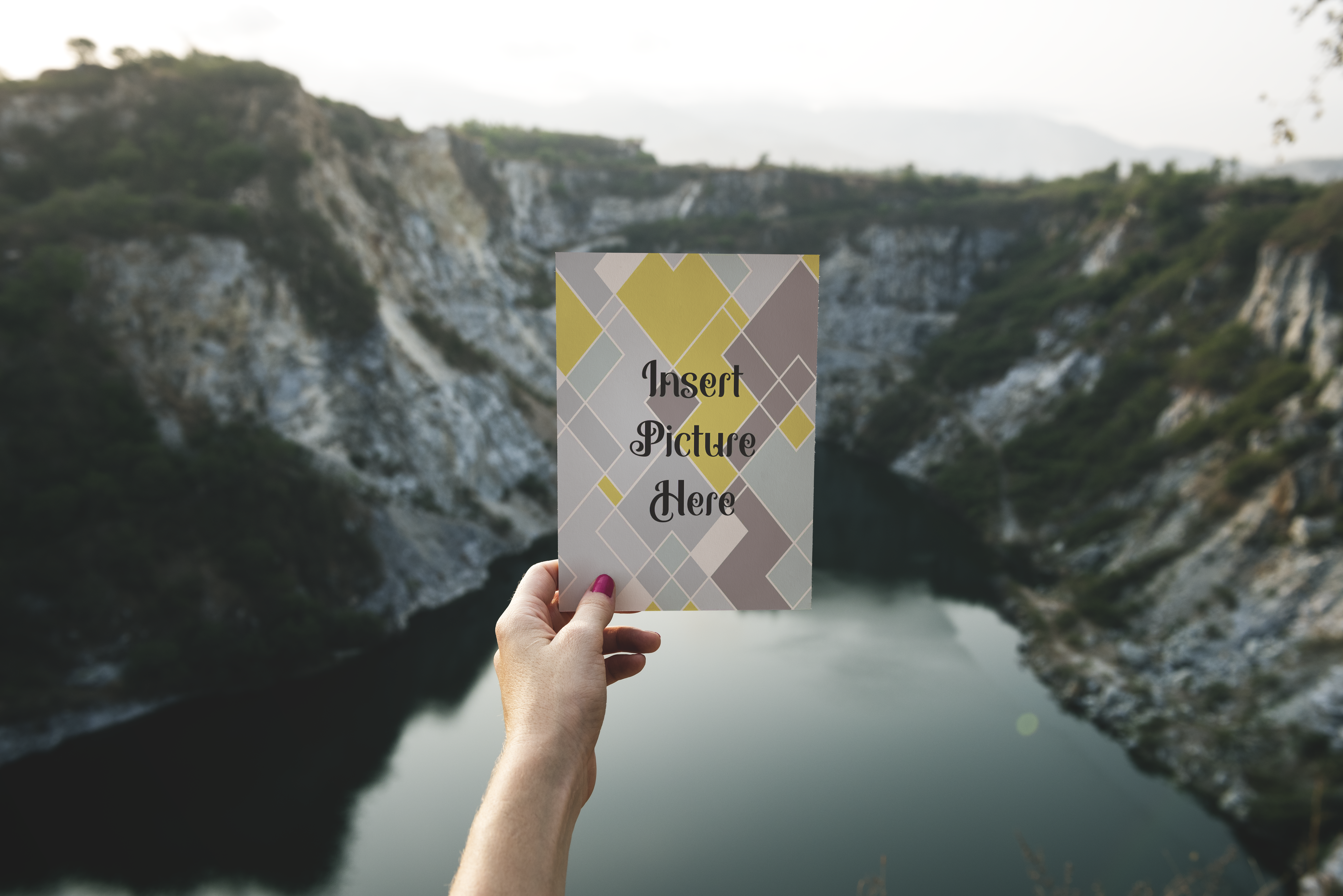 This mockup features a person holding a card against a scenic background of lush, jagged cliffs surrounding a serene lake. The card has a geometric design in pastel colors, adding a modern touch. You can use this mockup to highlight your product or event by placing your image on the card. Perfect for nature-themed promotions or minimalistic designs. Use the mockup generator to create your personalized design and share it on social media for maximum engagement!