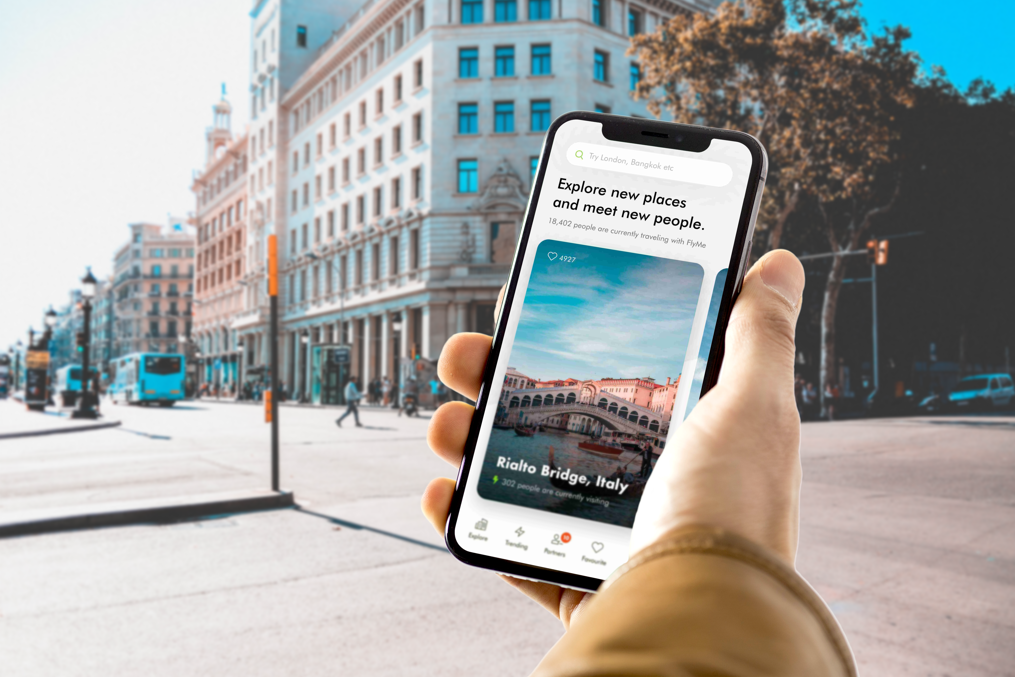 A person holds a smartphone displaying a travel app in an urban setting with grand buildings and a broad street with buses and pedestrians in the background. The app screen shows scenic photography of a famous landmark, user icons, and navigation tabs. This mockup effectively visualizes your app in a real-world environment, making it ideal for advertising purposes. Use our mockup generator to create stunning designs and share them on social media to captivate your audience and boost engagement!