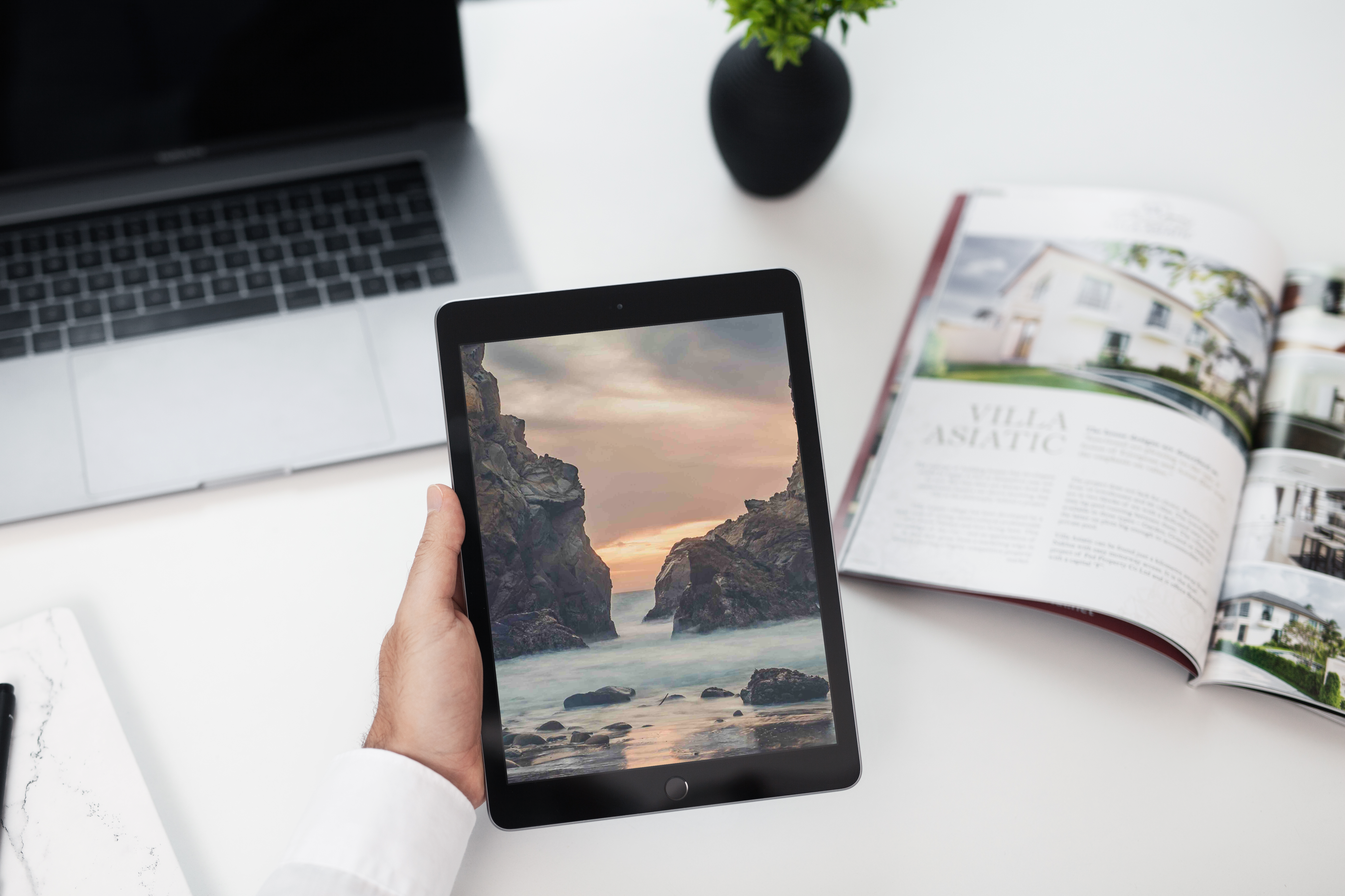 The image depicts a workspace setting with a white desk background. The main object is a black tablet, held by a hand, displaying a scenic coastal view at sunset. Surrounding the tablet are a laptop, an open magazine, and a small plant, creating a professional and clean atmosphere. This mockup is perfect for advertising digital artwork, apps, or e-books. Use our mockup generator to showcase your designs and share your creativity on social media!